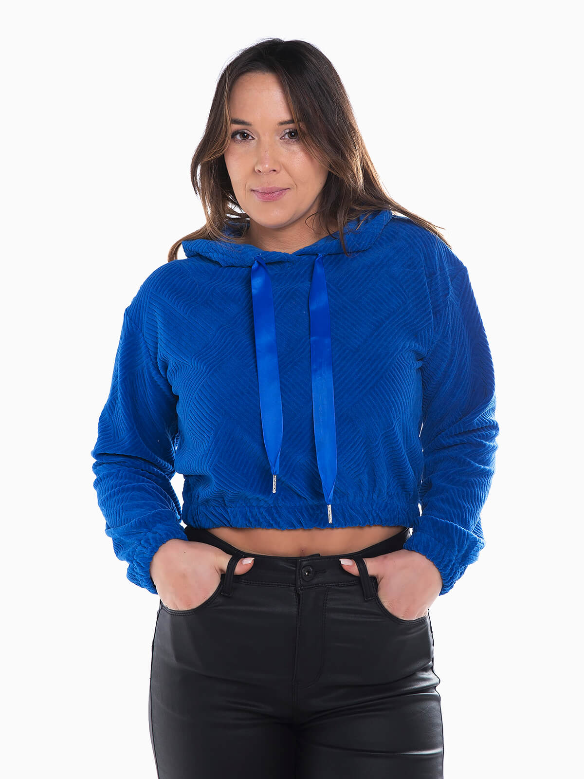 Sweatshirt curta em tecido aveludado trabalhado. Hoodie manga comprida com cordão para ajustar. Cós elástico.
