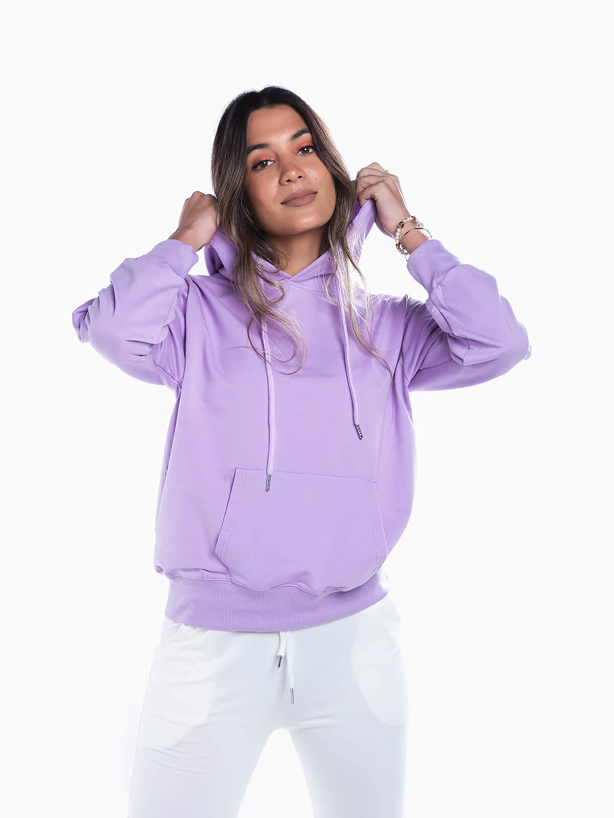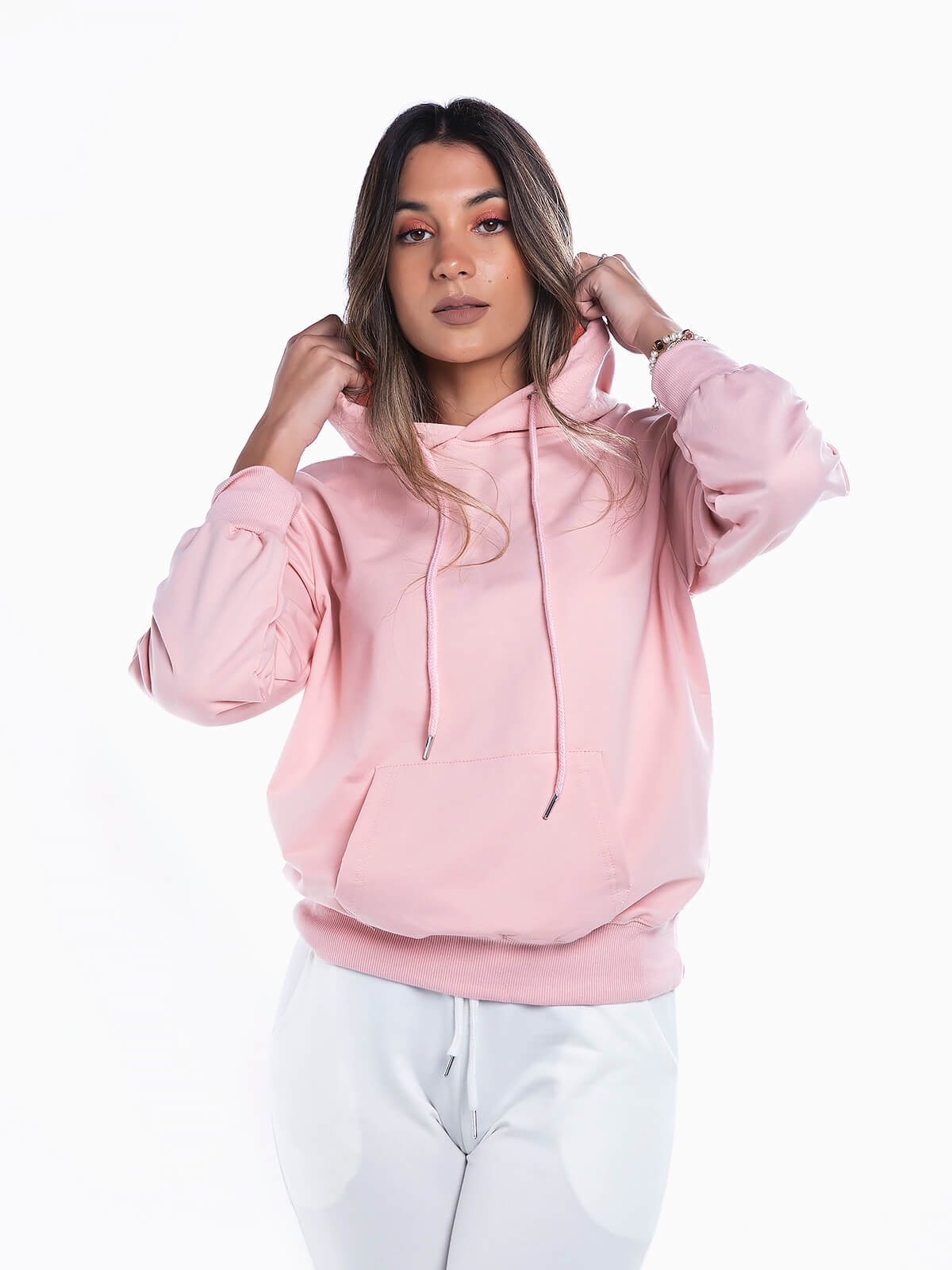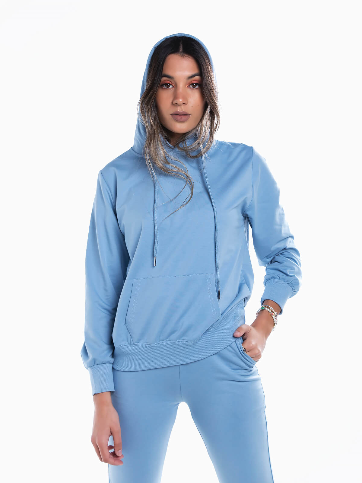 Sweatshirt básica com capuz para senhora. Camisola desportiva manga comprida com cós e punhos elásticos. Bolso canguru.
