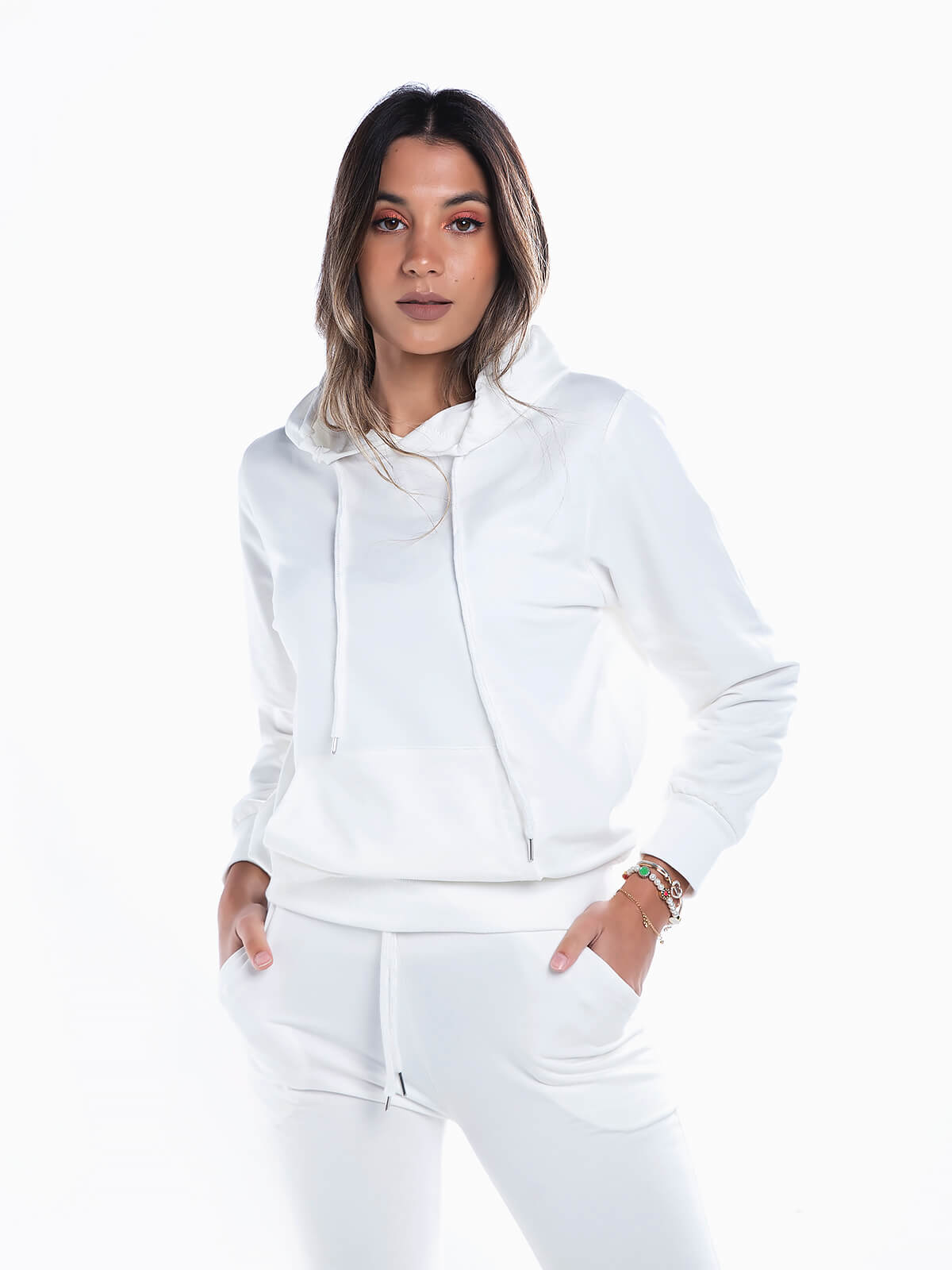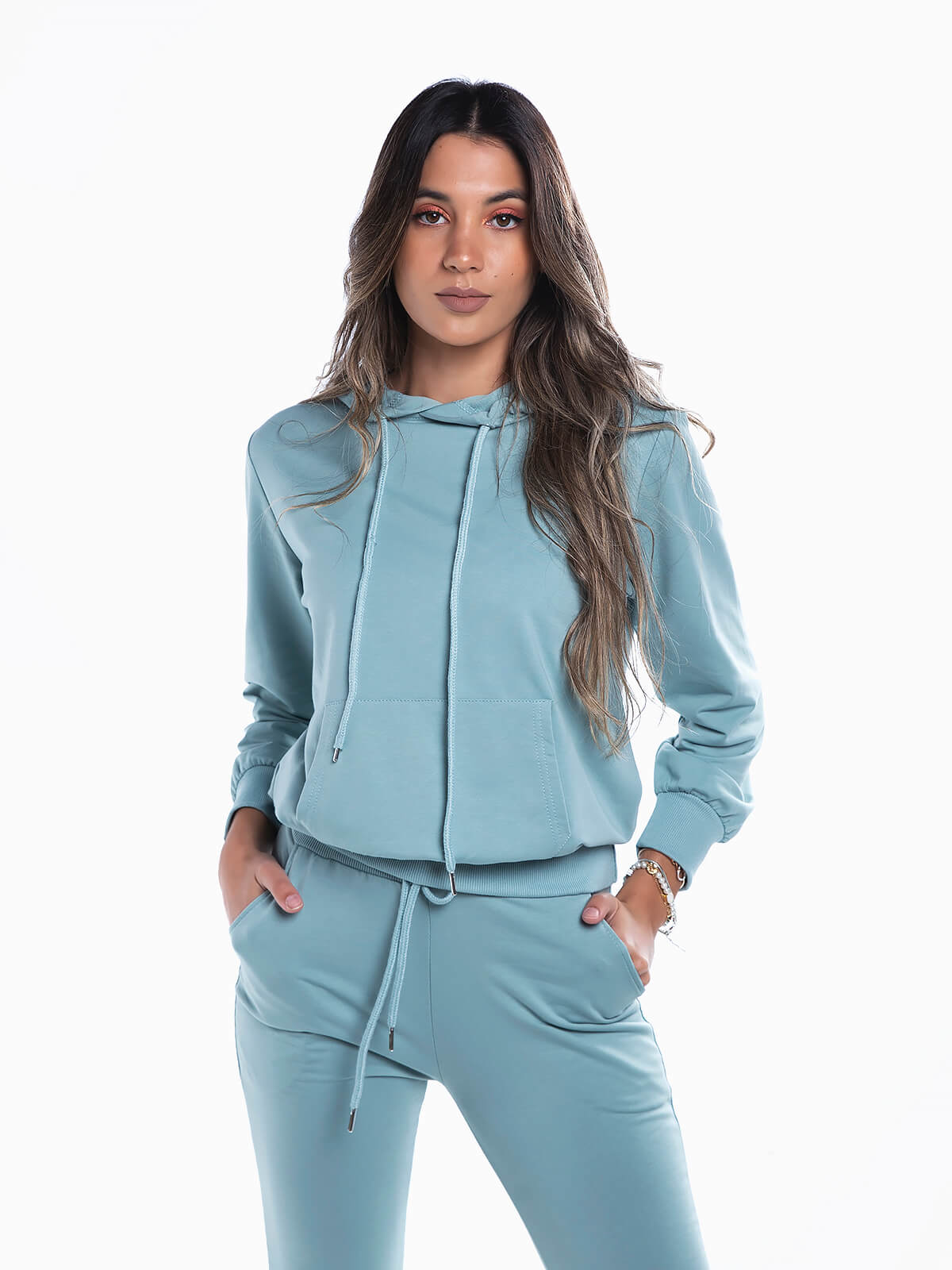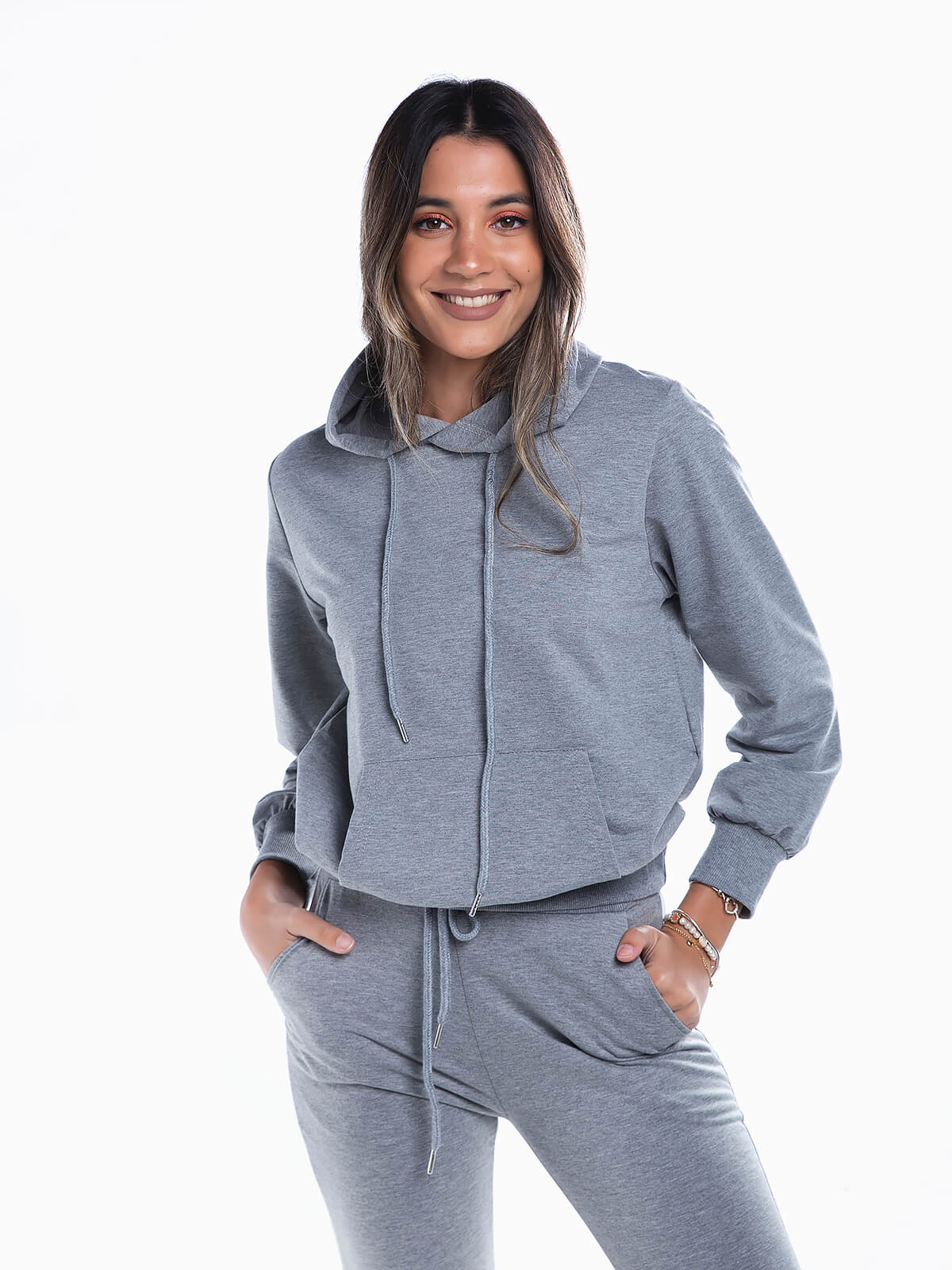 Sweatshirt básica com capuz para senhora. Camisola desportiva manga comprida com cós e punhos elásticos. Bolso canguru.