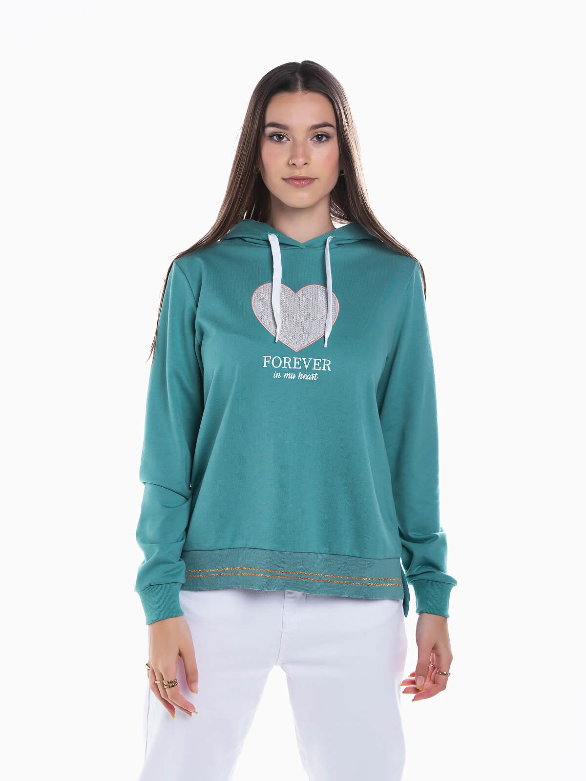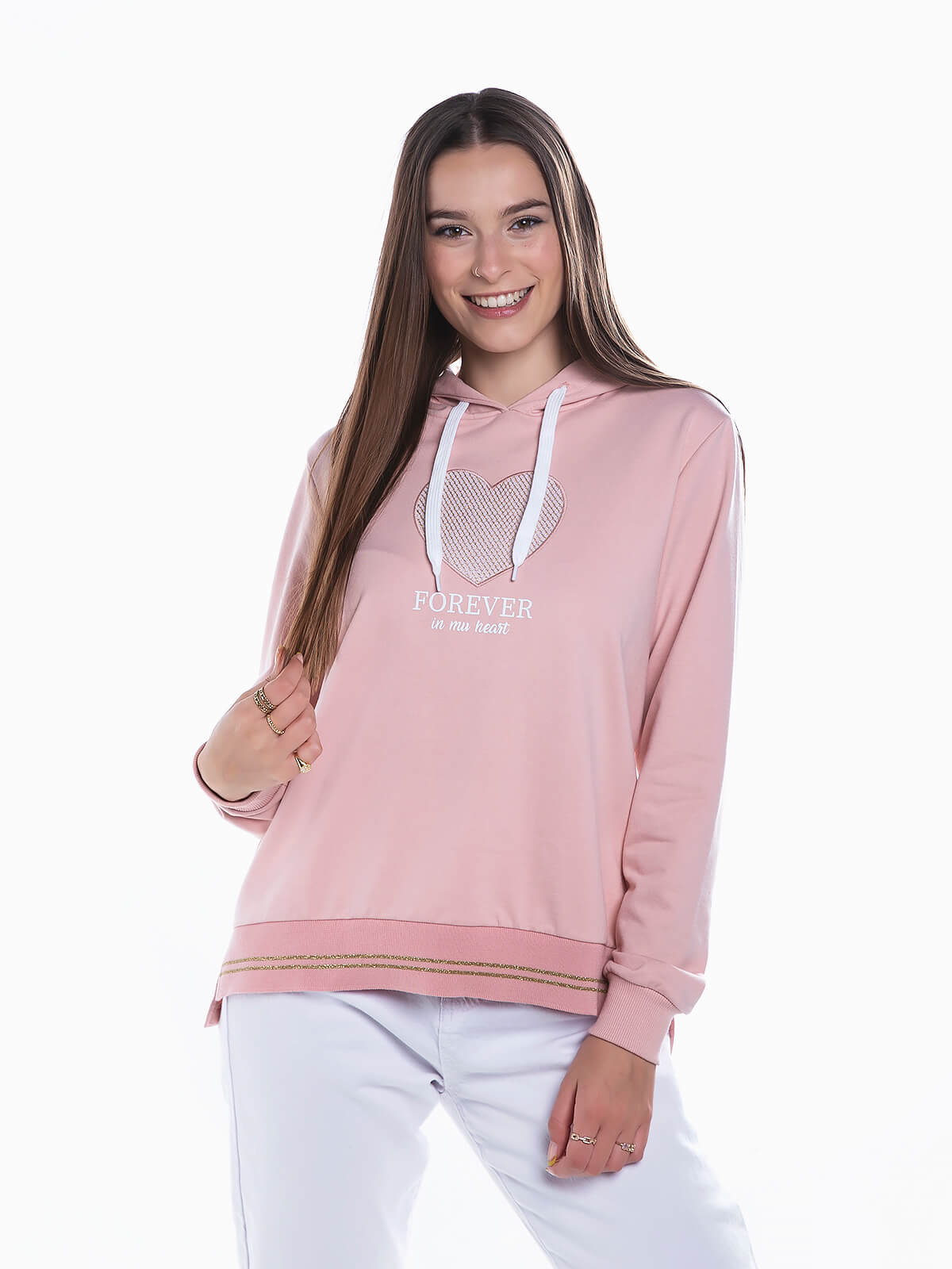 Sweatshirt com capuz e cordão para ajustar. Hoodie com coração bordado no peito e letras estampadas. Manga comprida. Base com aberturas laterais e riscas em fios lurex. Extremidades elásticas.