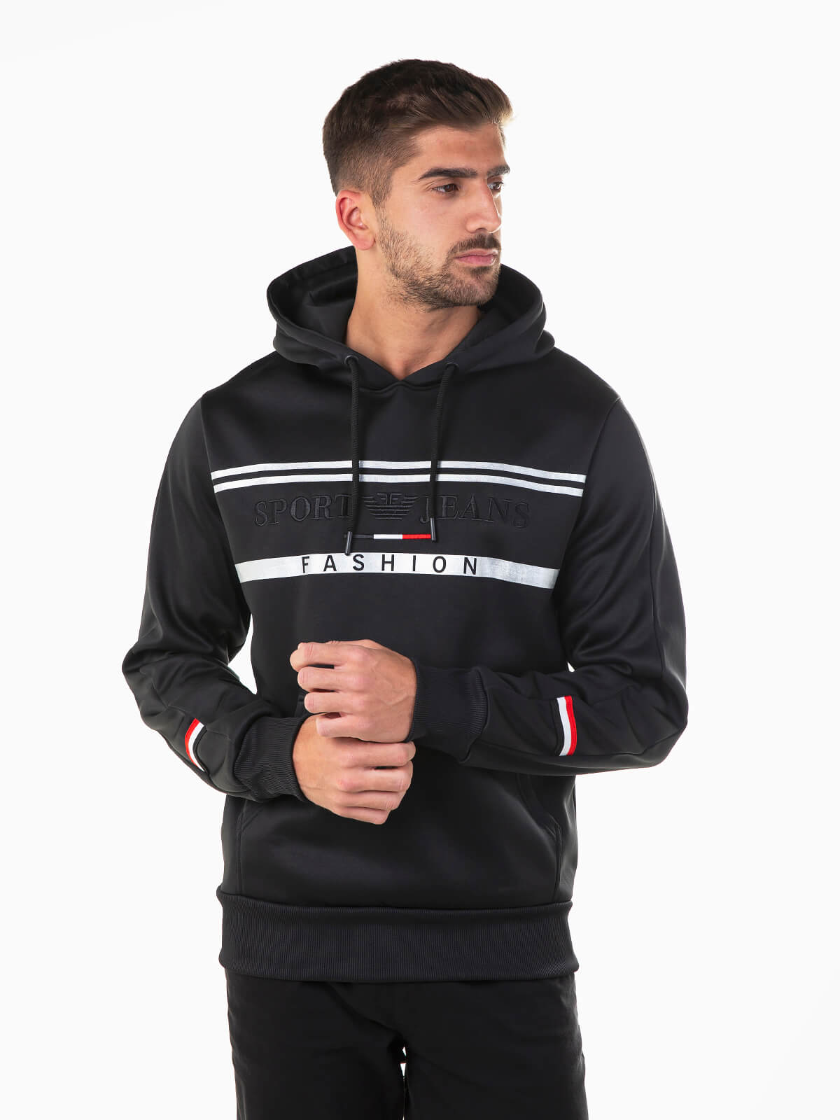 Sweatshirt com capuz e cordão para ajustar. Hoodie cardada manga comprida com acabamentos canelados. Bolso canguru. Bordados no peito.