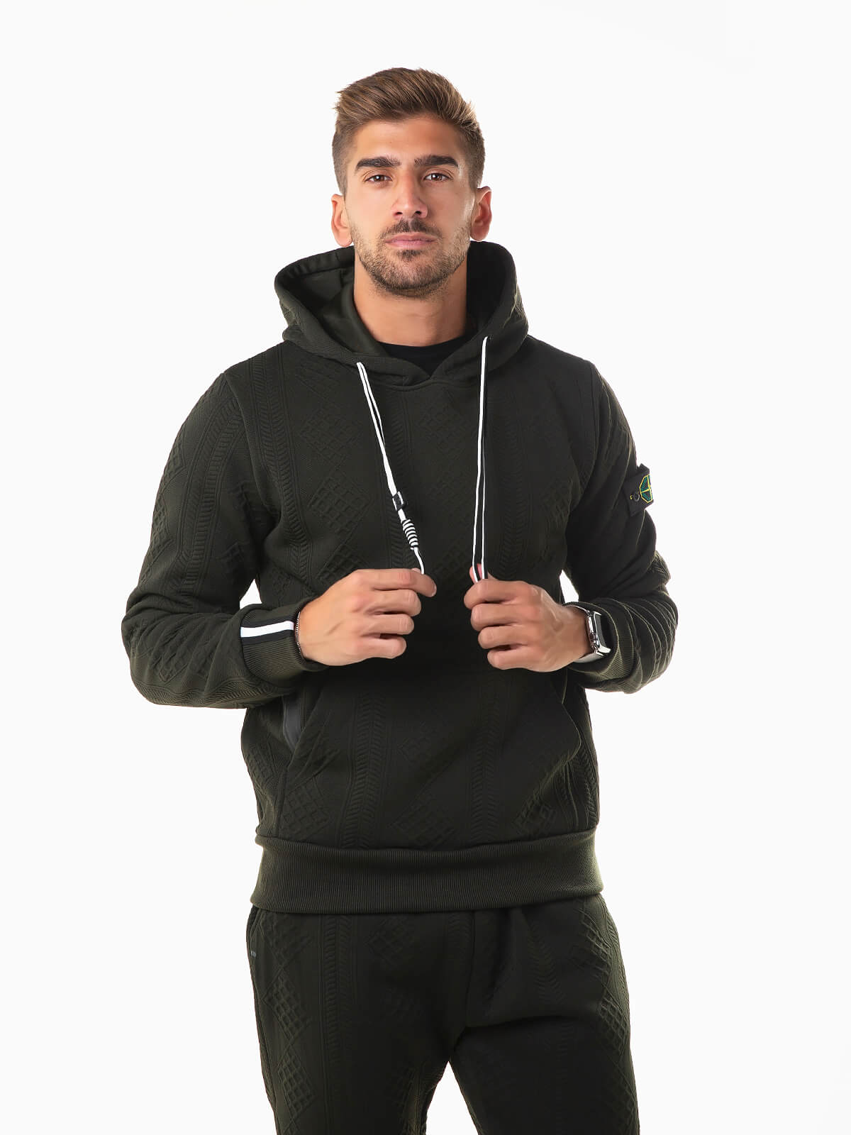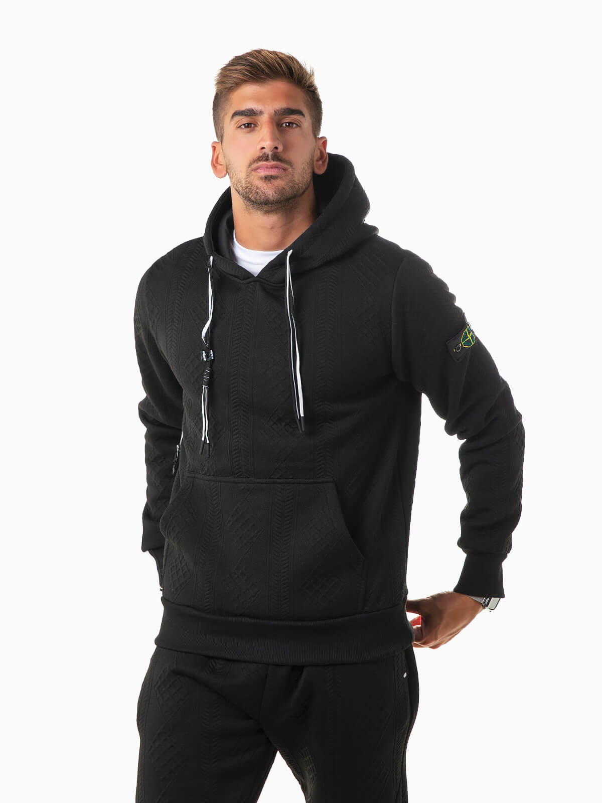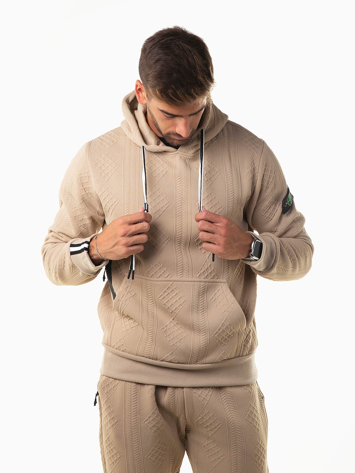 Sweatshirt com capuz em malha trabalhada e interior cardado. Hoodie com elástico no capuz para ajustar e bolso canguru. Manga comprida. Acabamentos elásticos.