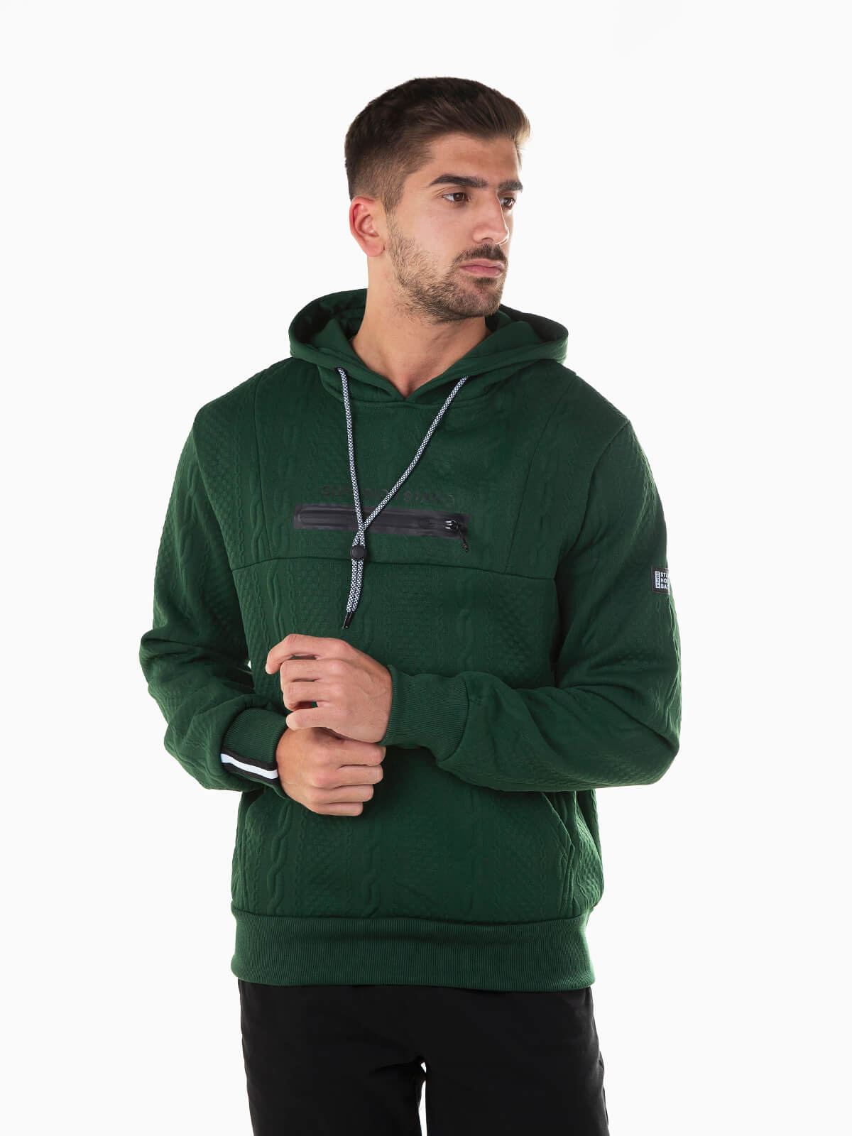Sweatshirt com capuz e cordão para ajustar. Hoodie estruturada para homem com interior cardado e acabamentos elásticos. Fecho no peito e bolso canguru.