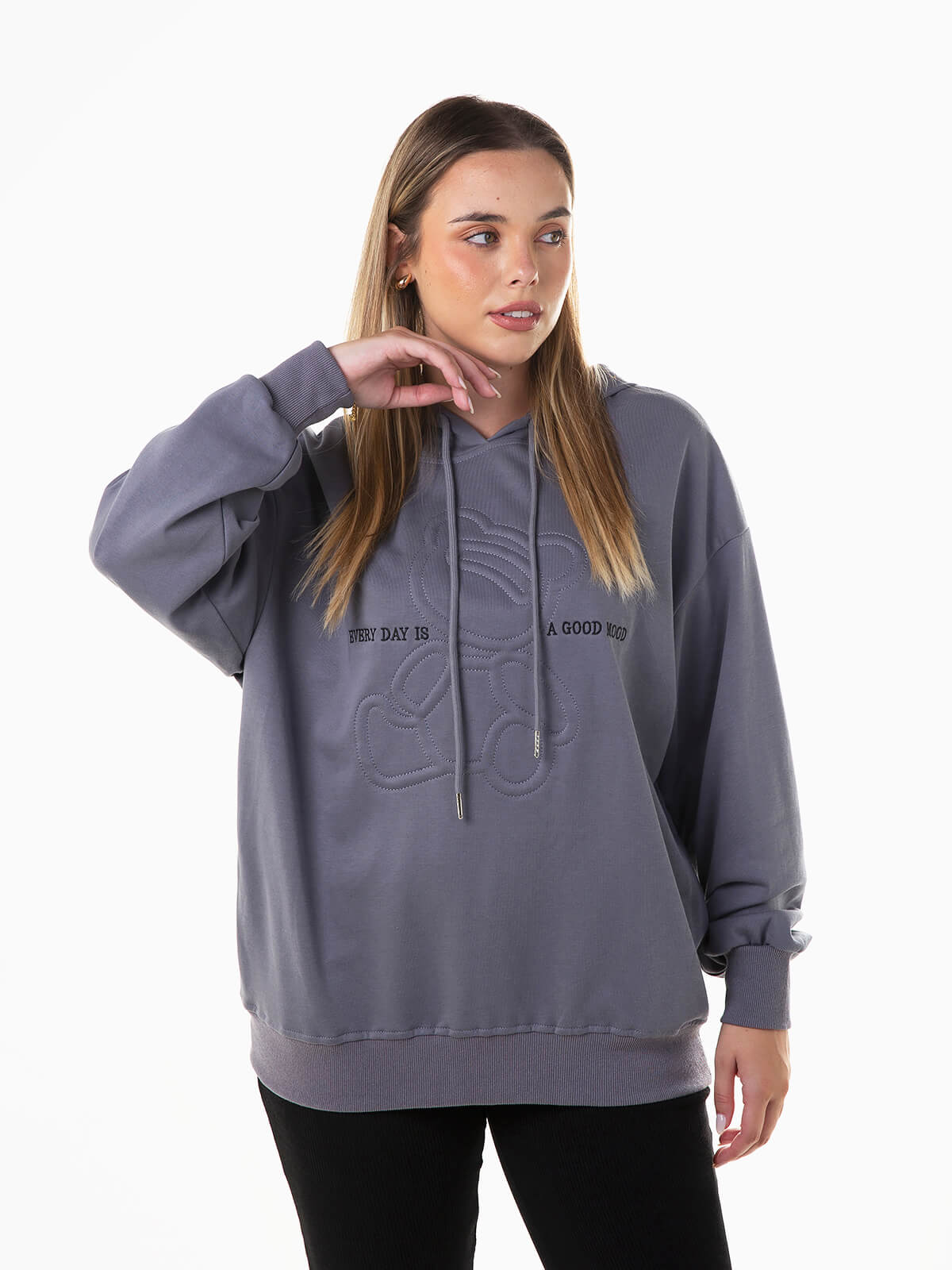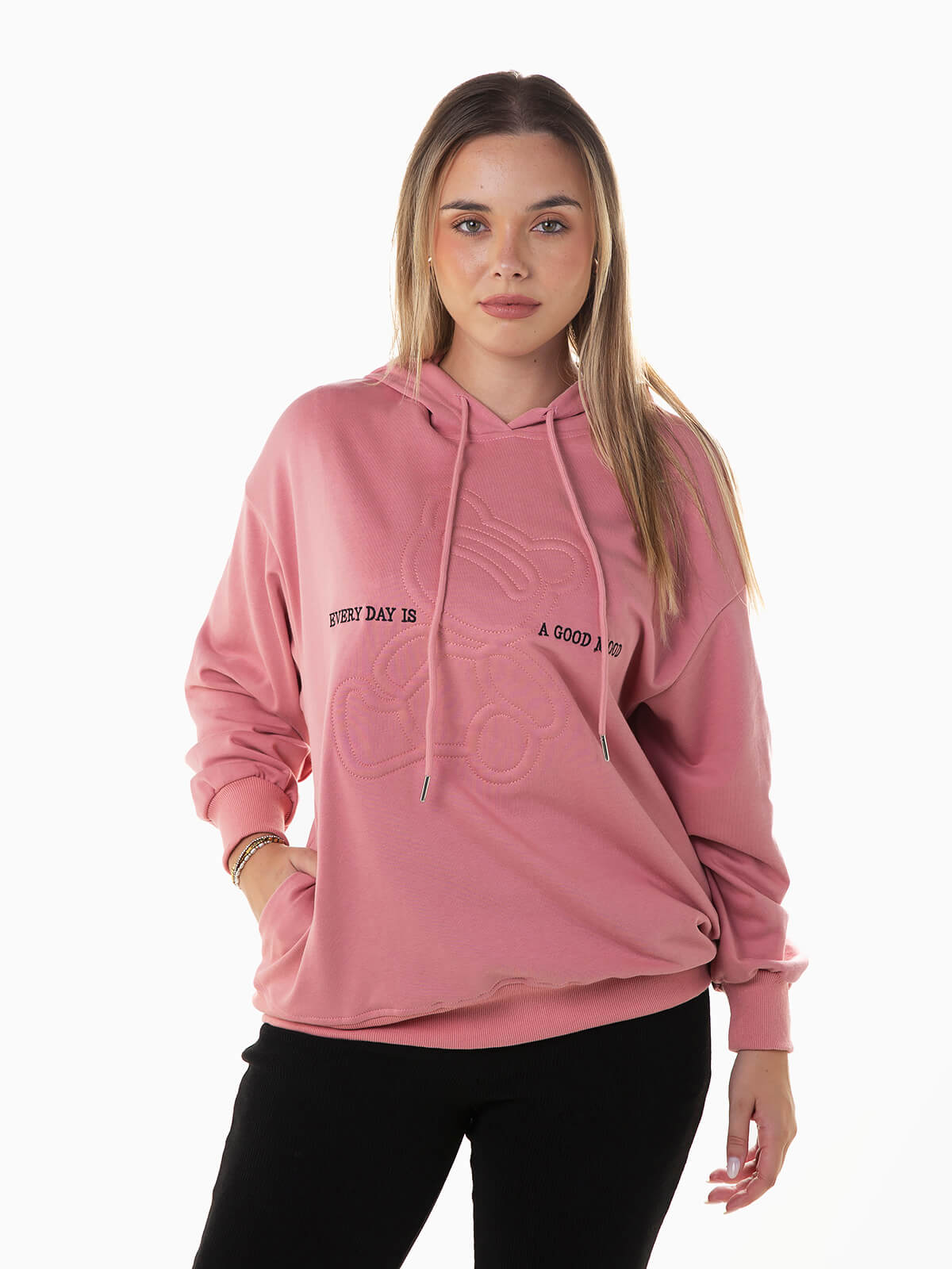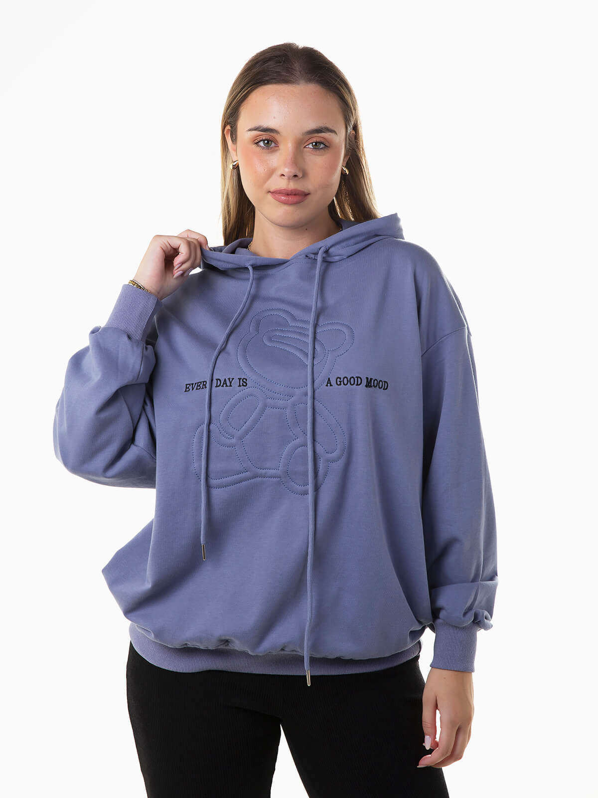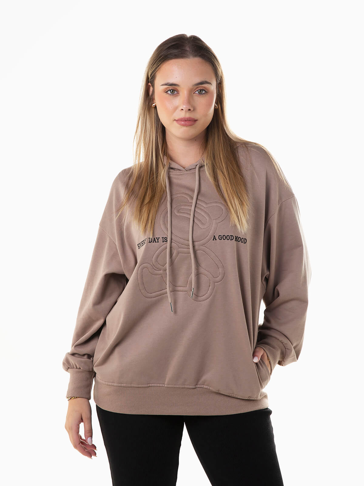 Sweatshirt com capuz e urso saliente à frente. Hoodie felpa com cordão para ajustar 2 bolsos laterais. Sem carda. Acabamentos canelados.