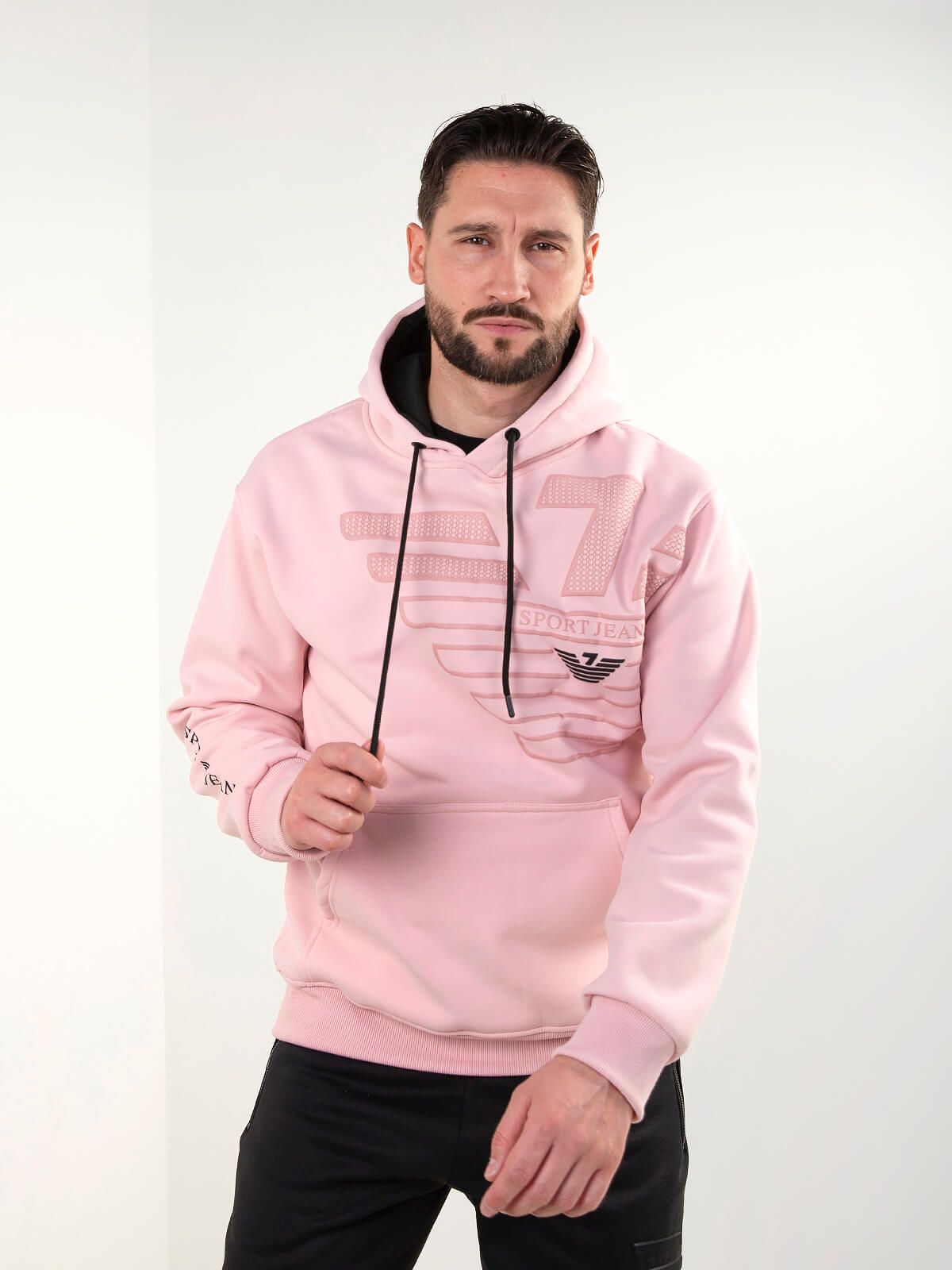 Sweat com capuz para homem em tecido confortável, com estampado em relevo na frente e bolso canguru. Punhos e bainha canelados para melhor ajuste. Disponível em várias cores.