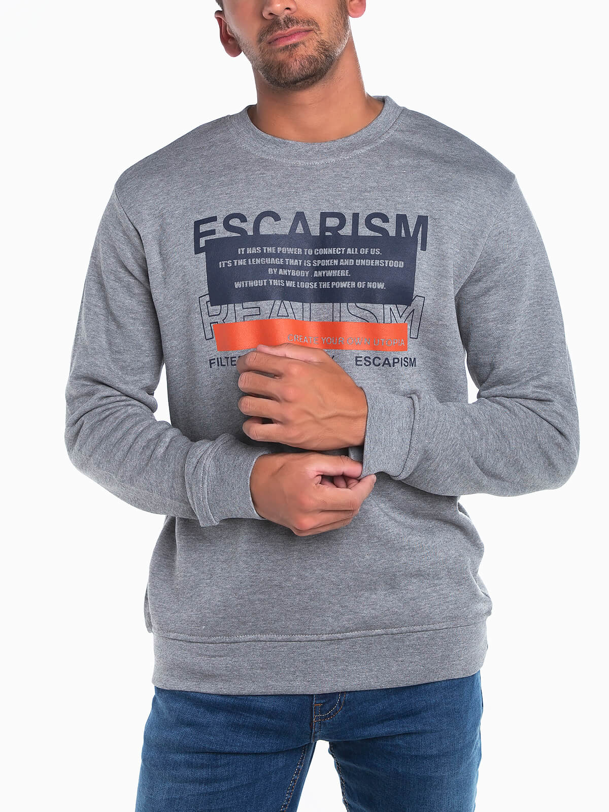 Sweatshirt cinza com estampado no peito. Sweatshirt mesclada manga comprida com interior cardado. Extremidades elásticas.