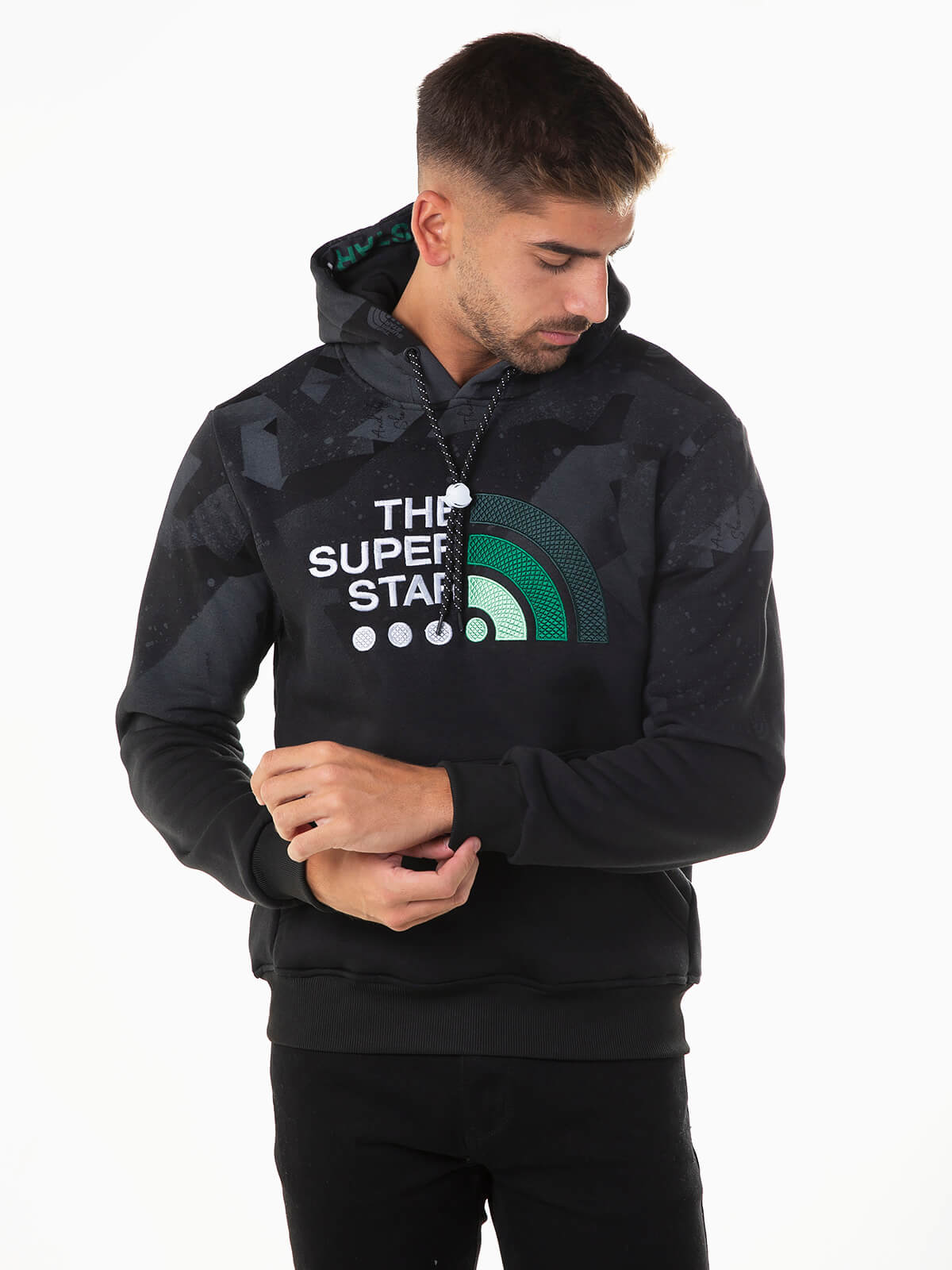Sweatshirt com capuz e bordados no peito. Hoodie para homem com cordão para ajustar e bolso canguru. Interior cardado. Acabamentos elásticos.