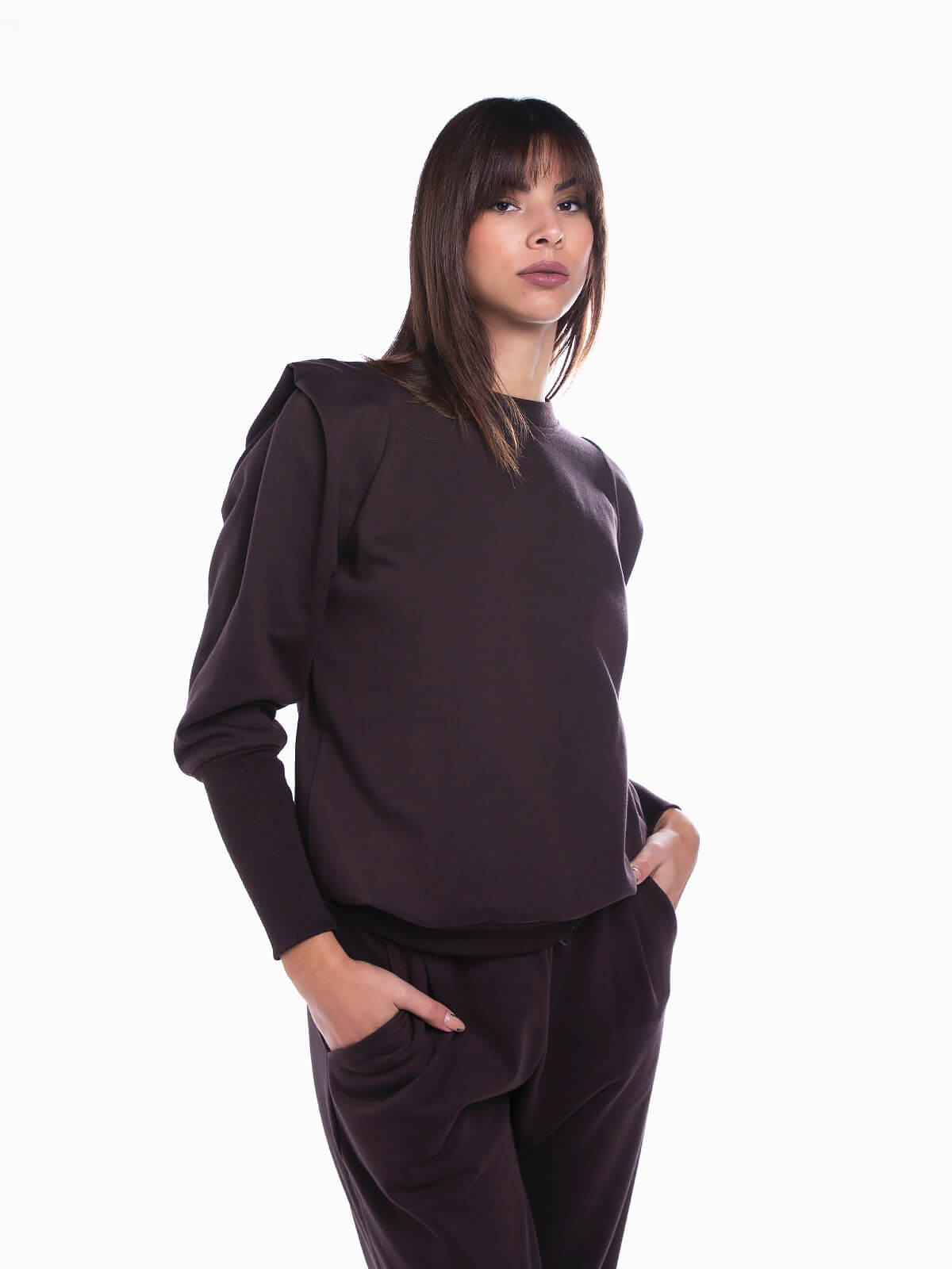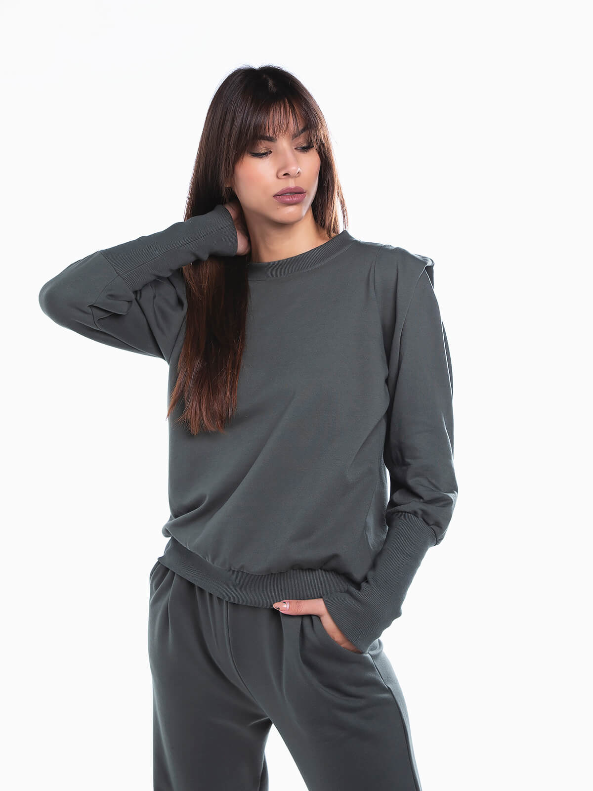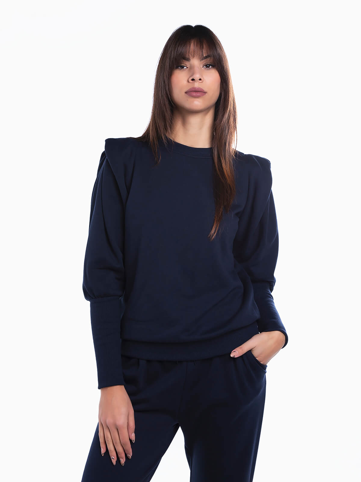 Sweatshirt com ombreiras para senhora. Sweatshirt cardada de manga comprida. Gola redonda. Punhos e cós elásticos.
