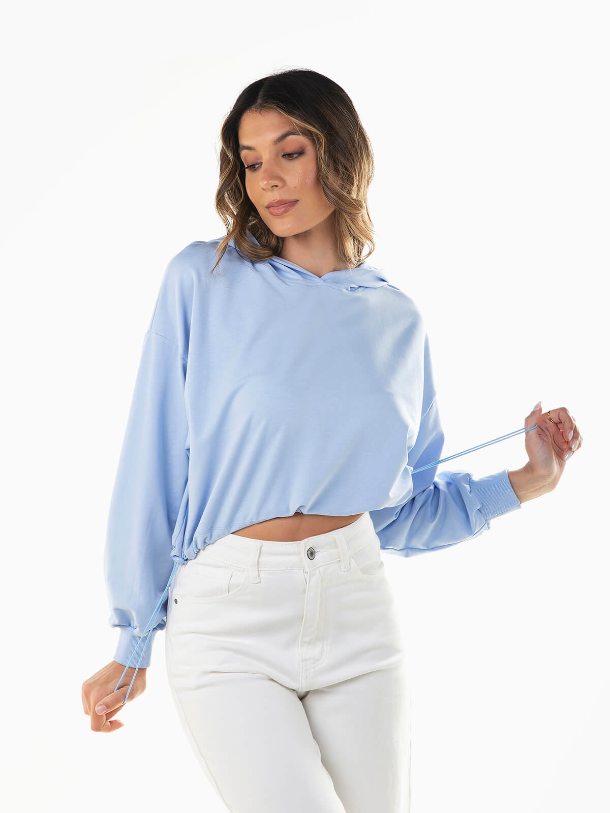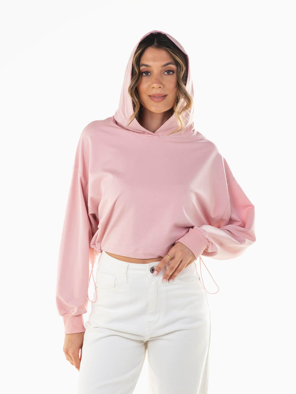 Sweatshirt oversized com capuz para mulher. Hoodie cropped com elástico na base para ajustar. Manga comprida.