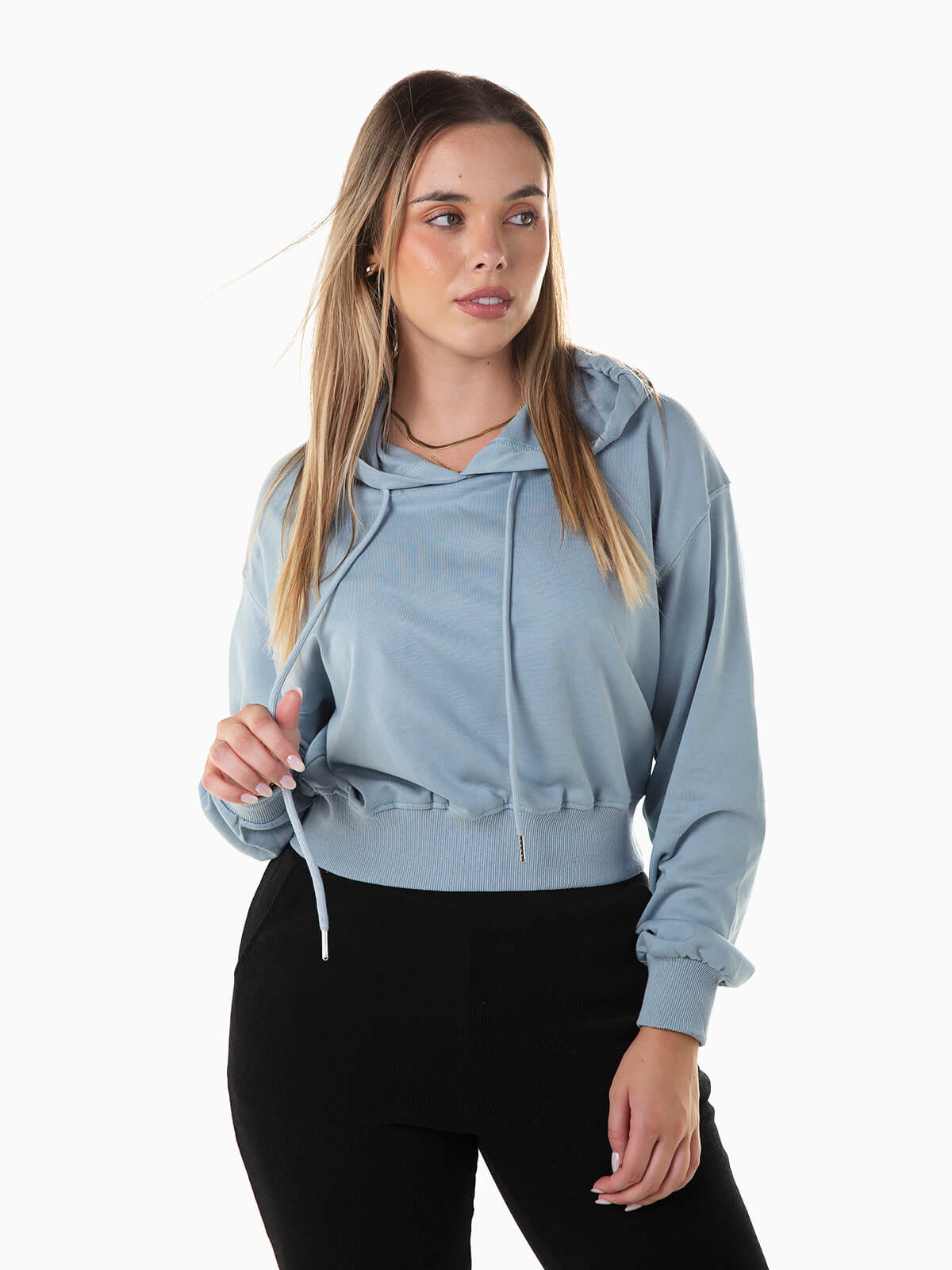 Sweatshirt curta com capuz e cordão para ajustar. Hoodie felpa sem carda com manga comprida e extremidades caneladas.