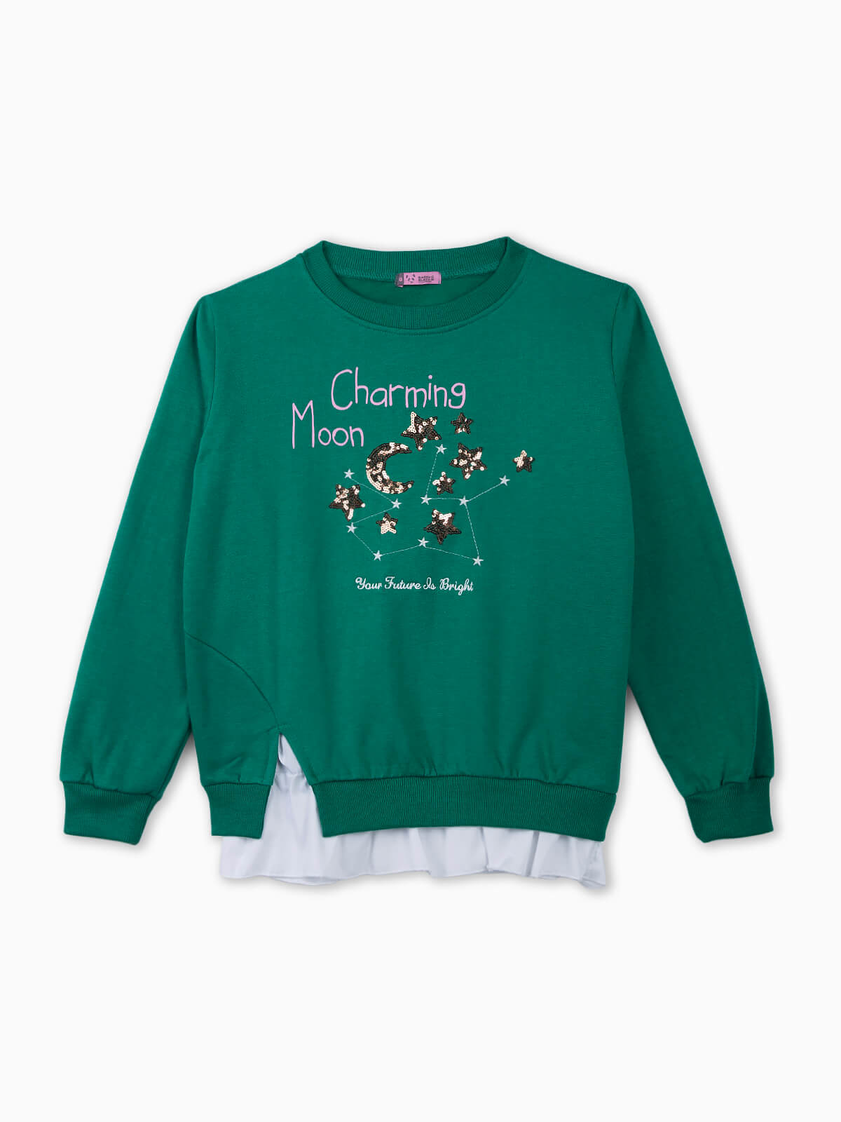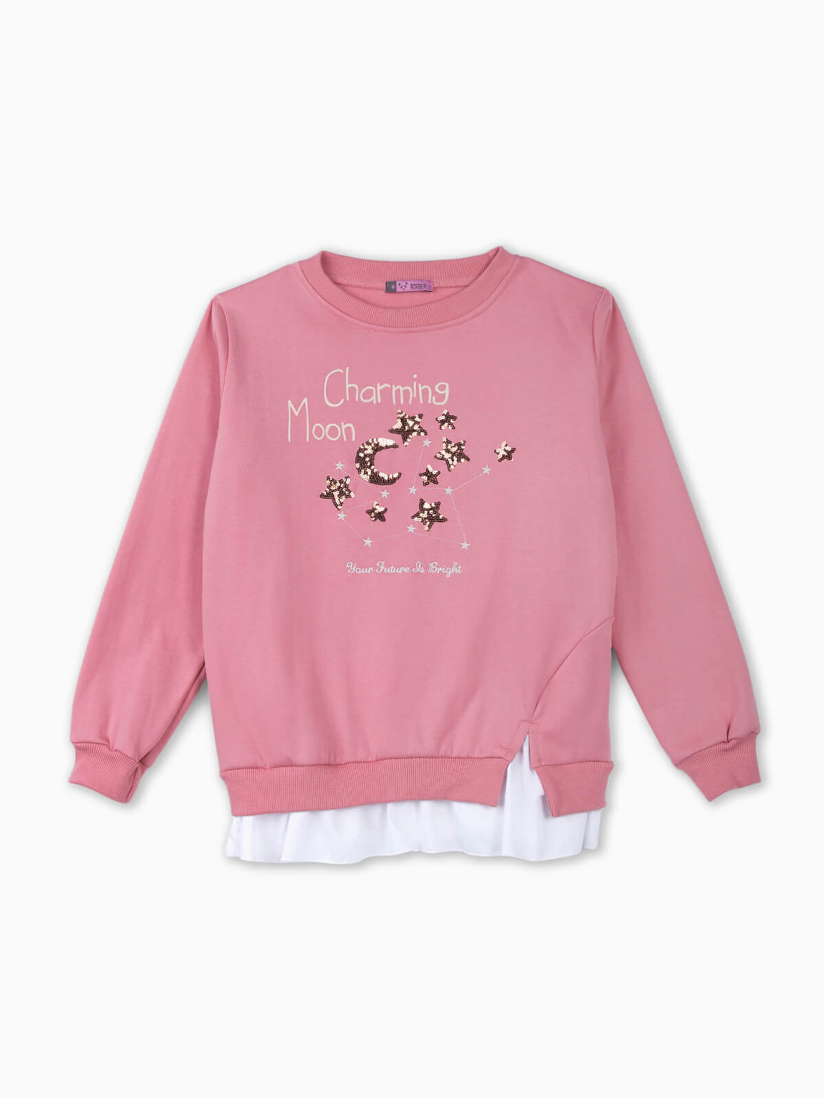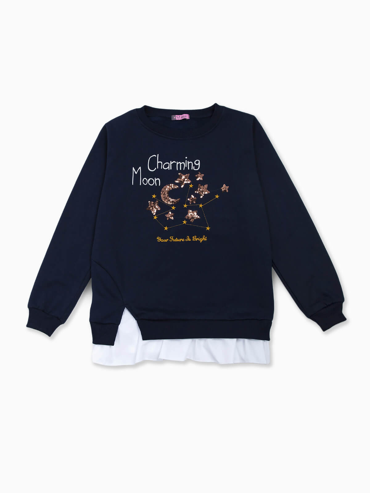 Sweatshirt com encaixe de tecido de blusa na base para menina. Sweatshirt manga comprida com interior cardado. Estampado de letras e lantejoulas aplicadas. Decote redondo. Acabamentos elásticos.