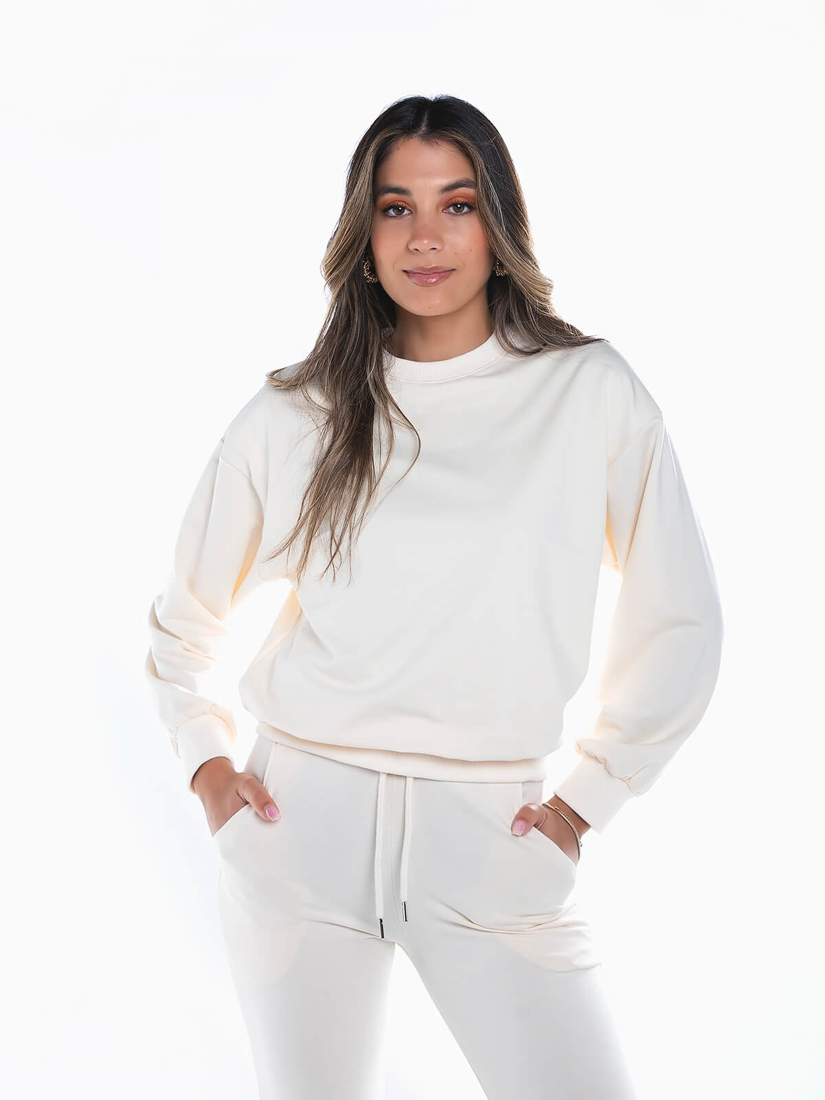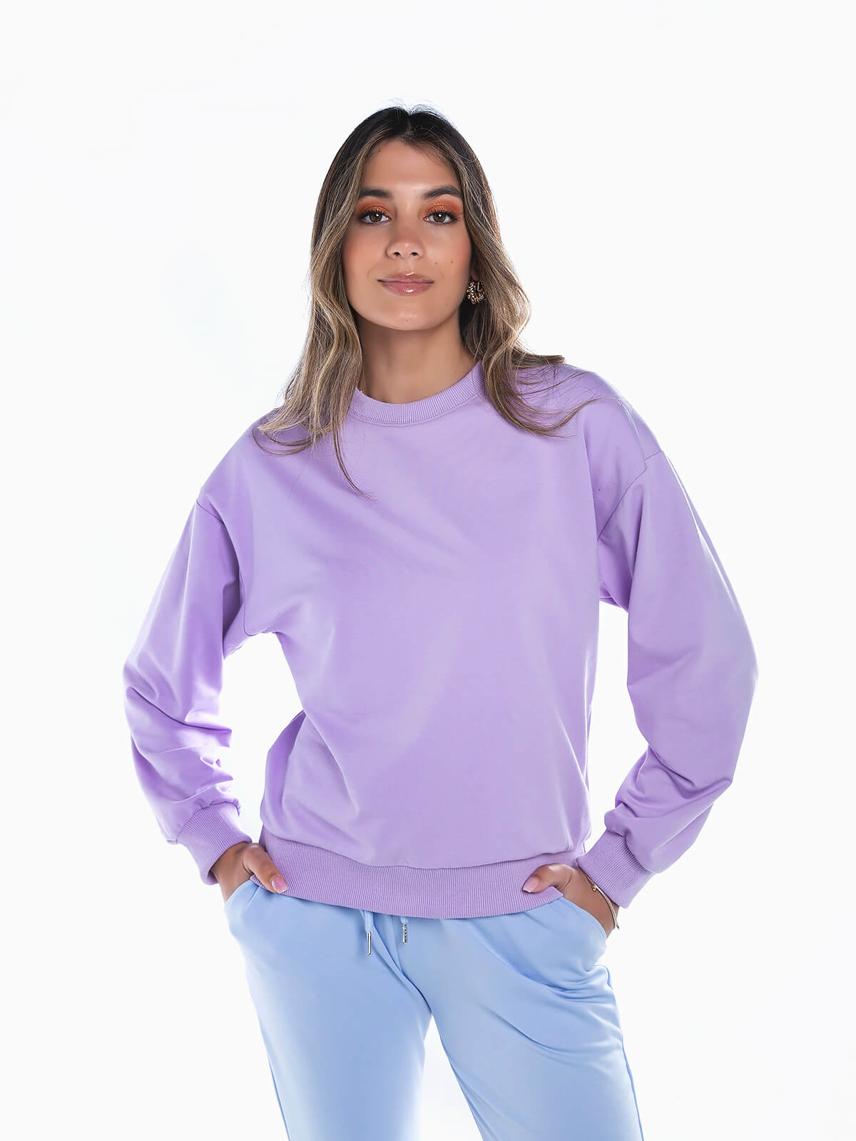 Sweatshirt em felpa de manga comprida para senhora. Sweatshirt básica com ombros descaídos. Decote redondo. Extremidades elásticas.
