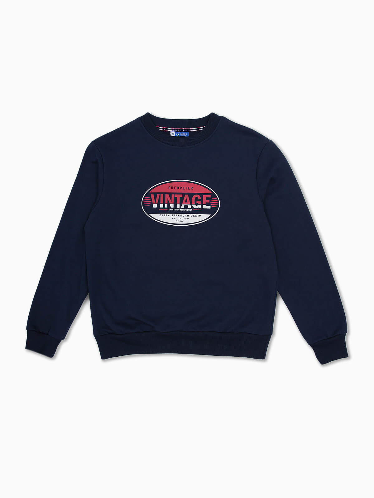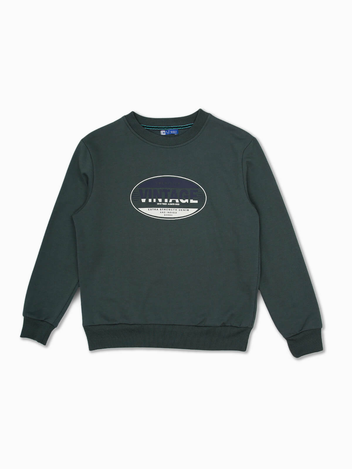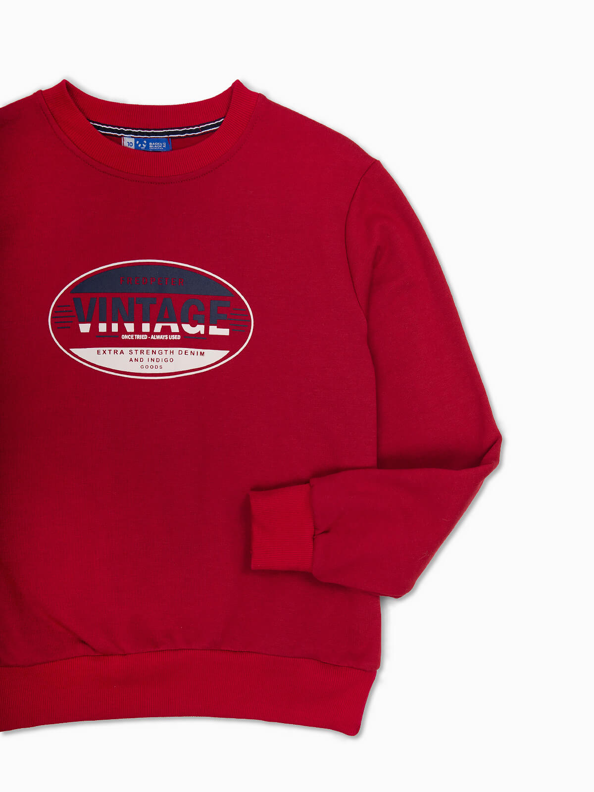 Sweatshirt para menino com estampado Vintage no peito. Sweatshirt cardada de manga comprida com gola redonda. Acabamentos canelados.