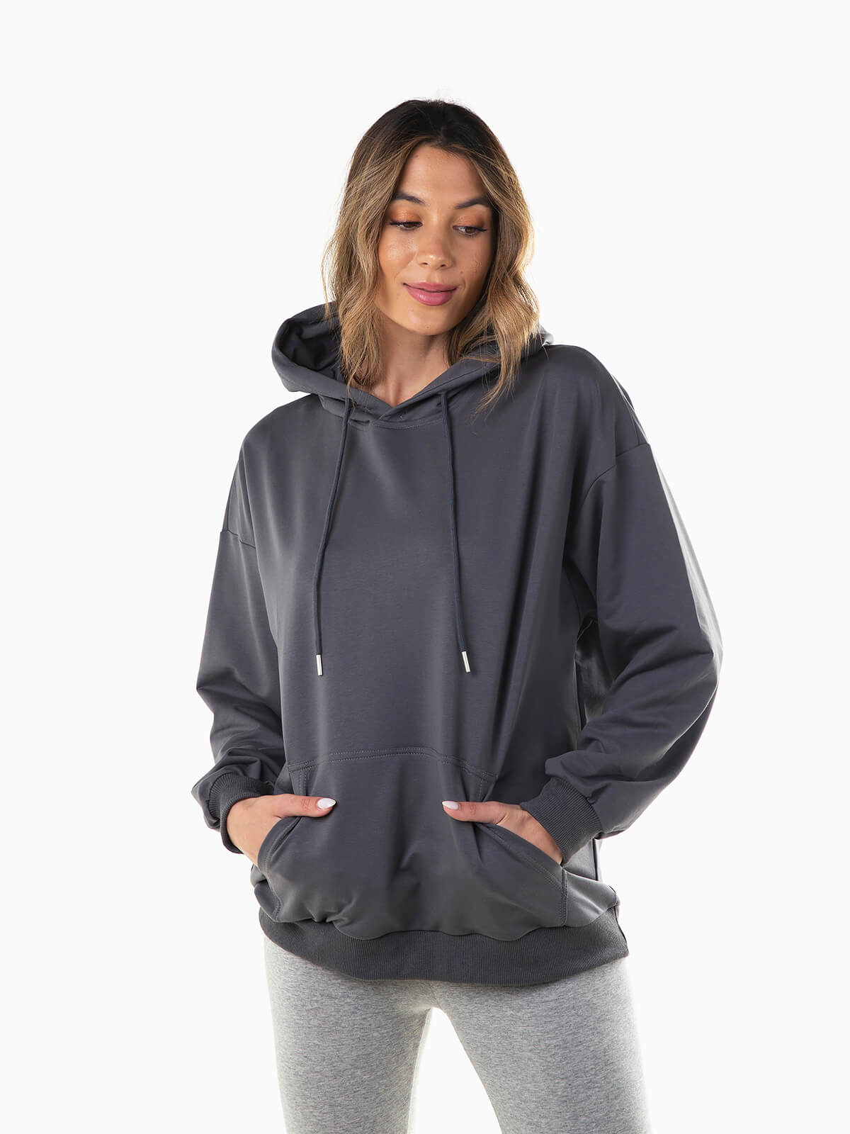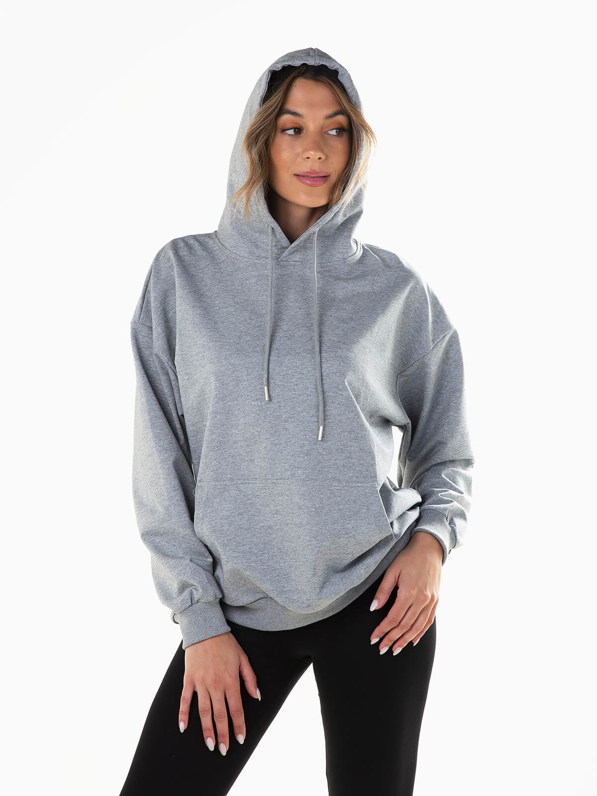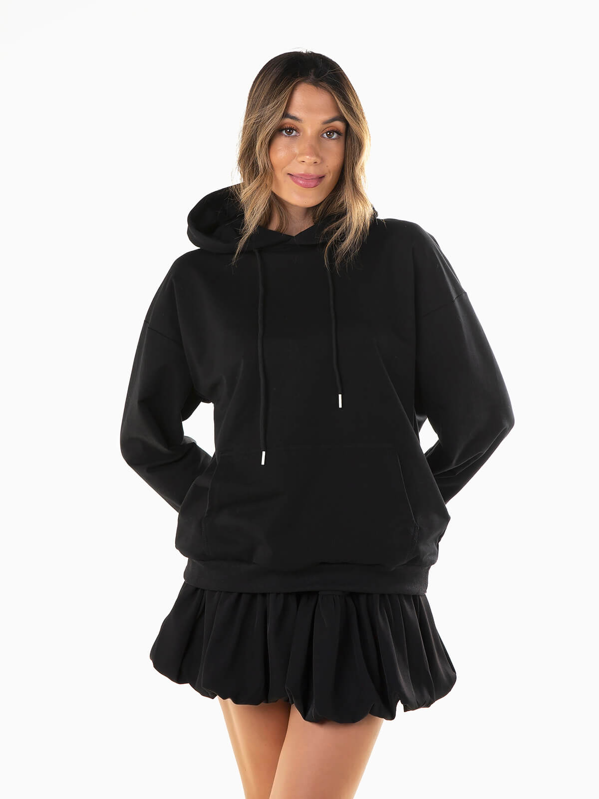 Sweatshirt oversize com capuz e cordão para ajustar. Hoodie para mulher com manga comprida e bolso canguru. Acabamentos canelados.