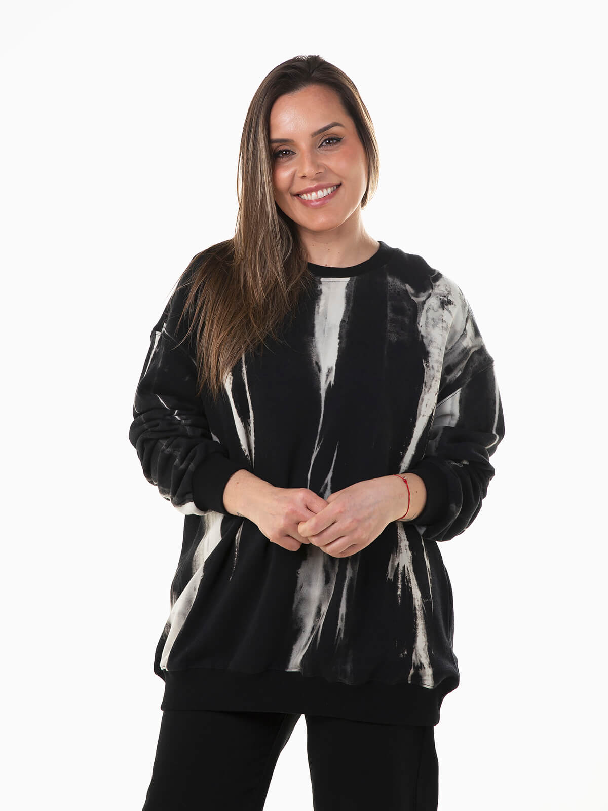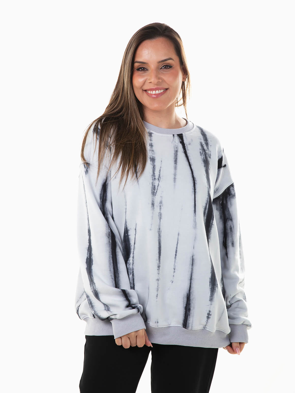 Sweatshirt oversized com estampado manchado em contraste. Sweatshirt manga comprida para mulher com acabamentos elásticos e decote redondo.
