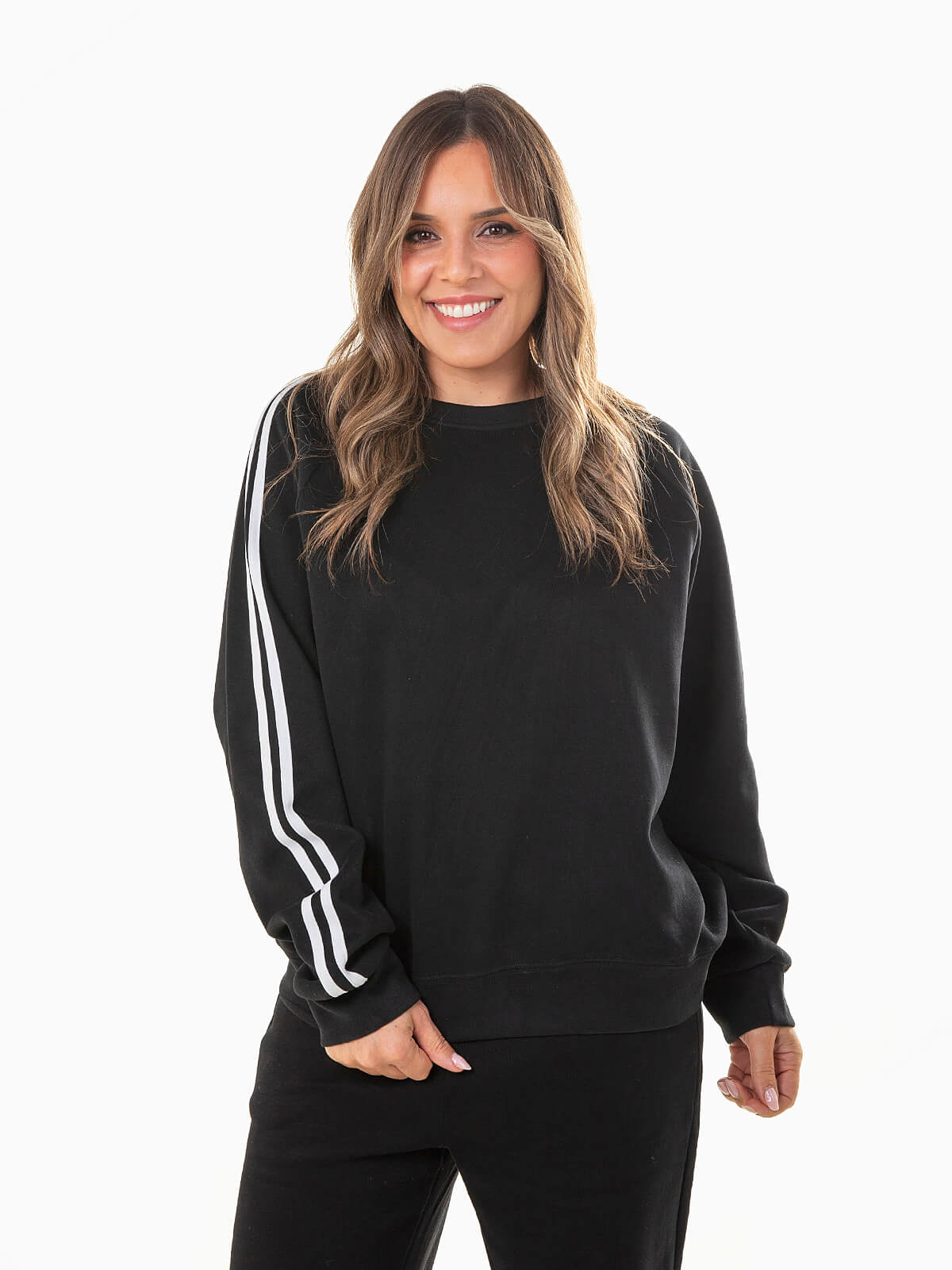 Sweatshirt oversized para mulher, com riscas laterais em contraste que adicionam um toque moderno e urbano. Confortável e versátil, apresenta gola redonda e acabamentos canelados para um ajuste perfeito. Ideal para quem procura estilo e conforto no dia a dia.