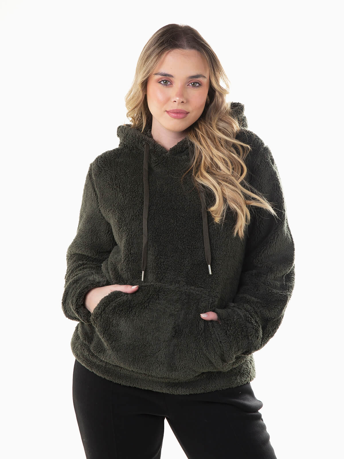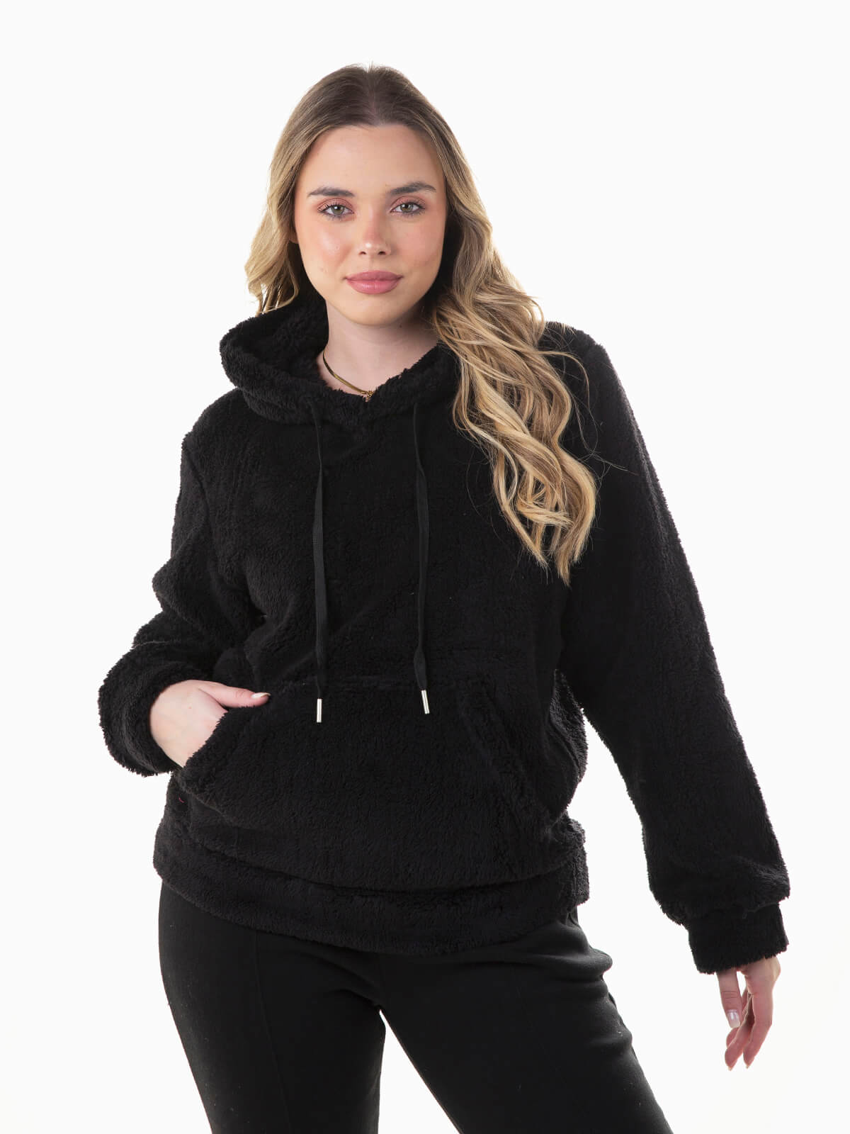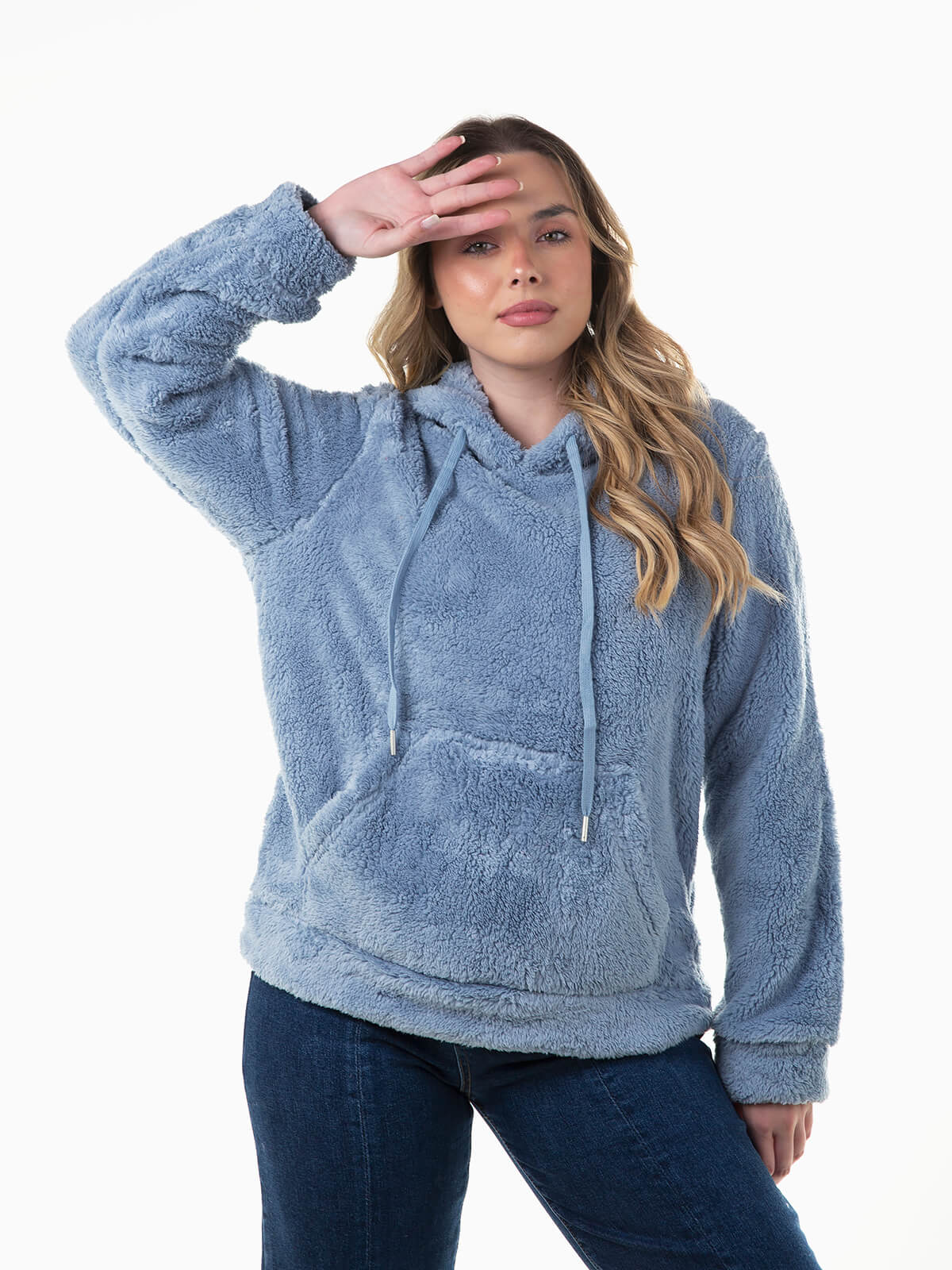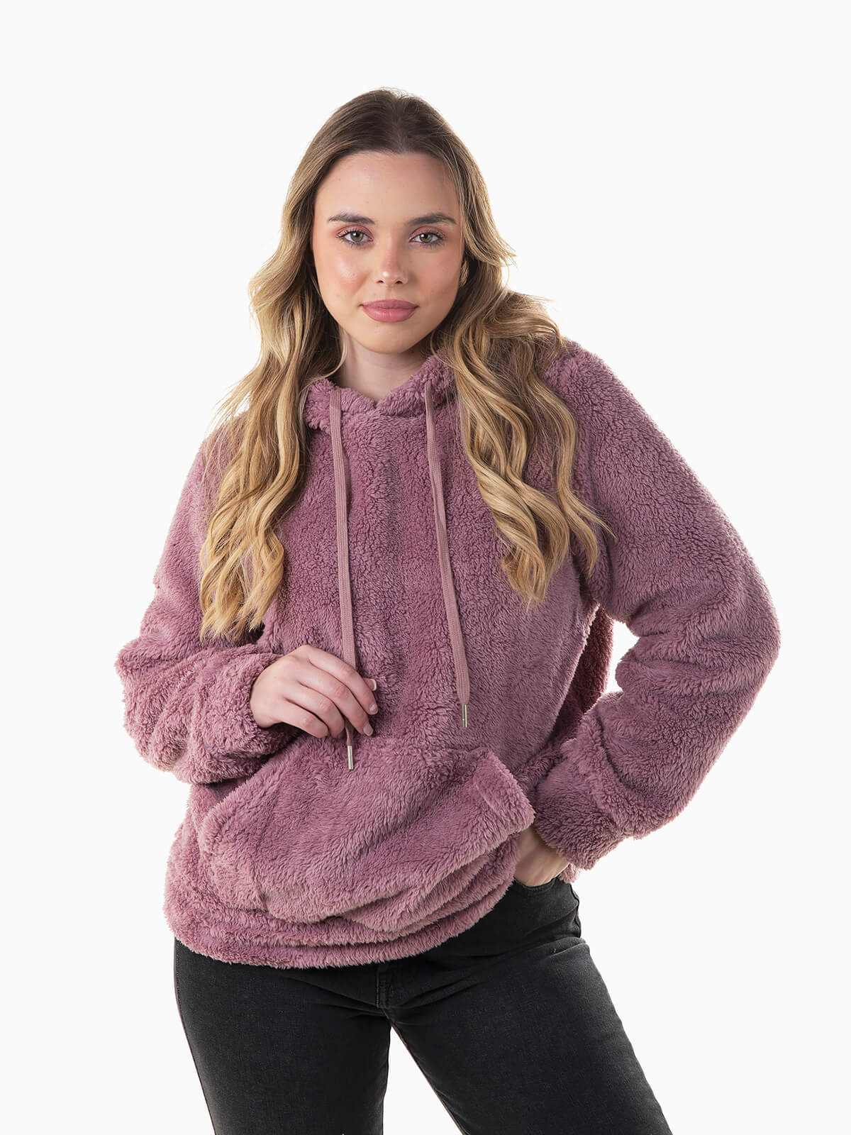 Sweatshirt de pelo com capuz e cordão para ajustar. Hoodie polar para mulher com manga comprida e bolso canguru.