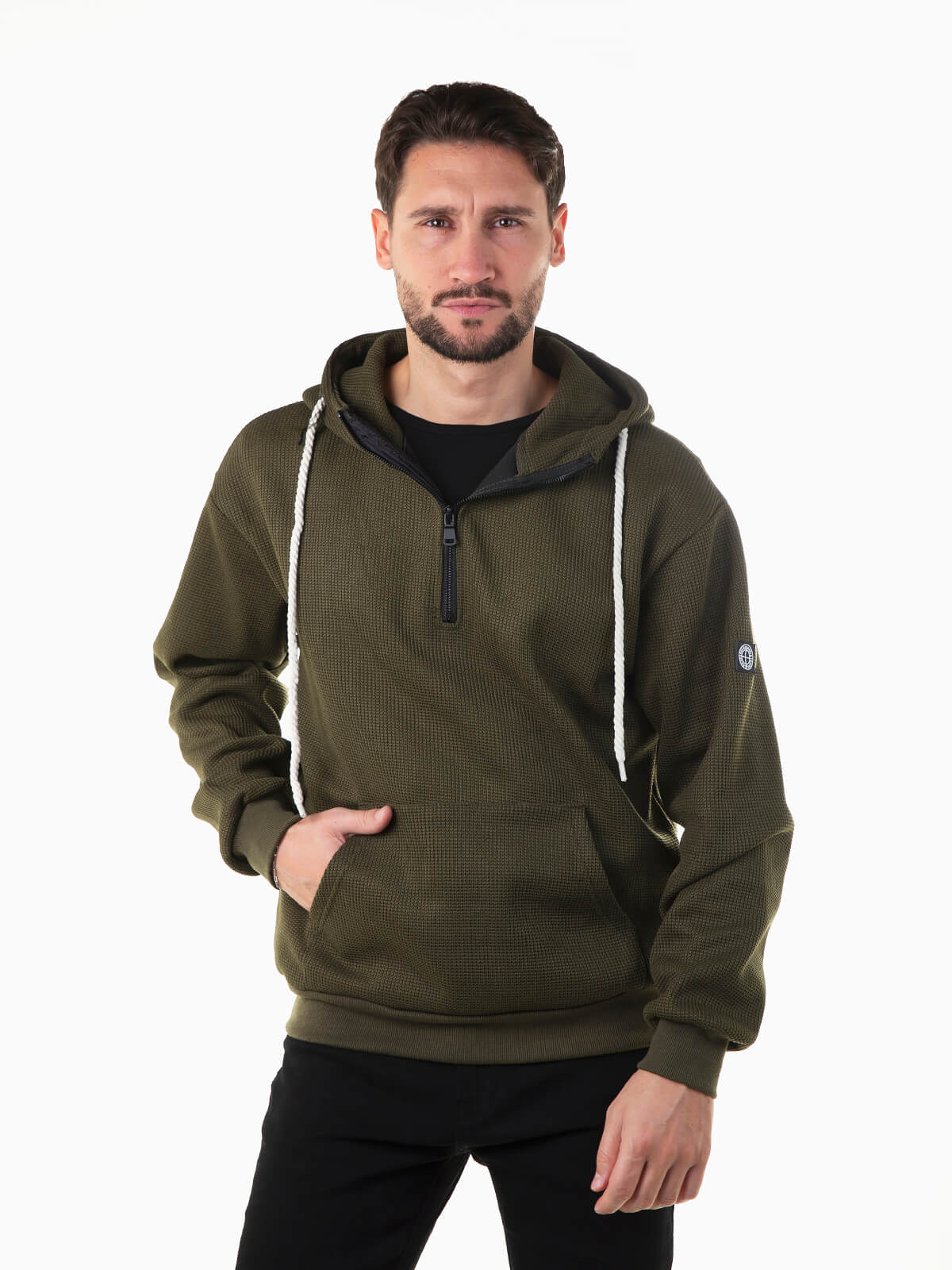 Sweatshirt de felpa com textura para homem. Hoodie manga comprida com capuz e cordão para ajustar. Bolso canguru e aperto fecho zíper.