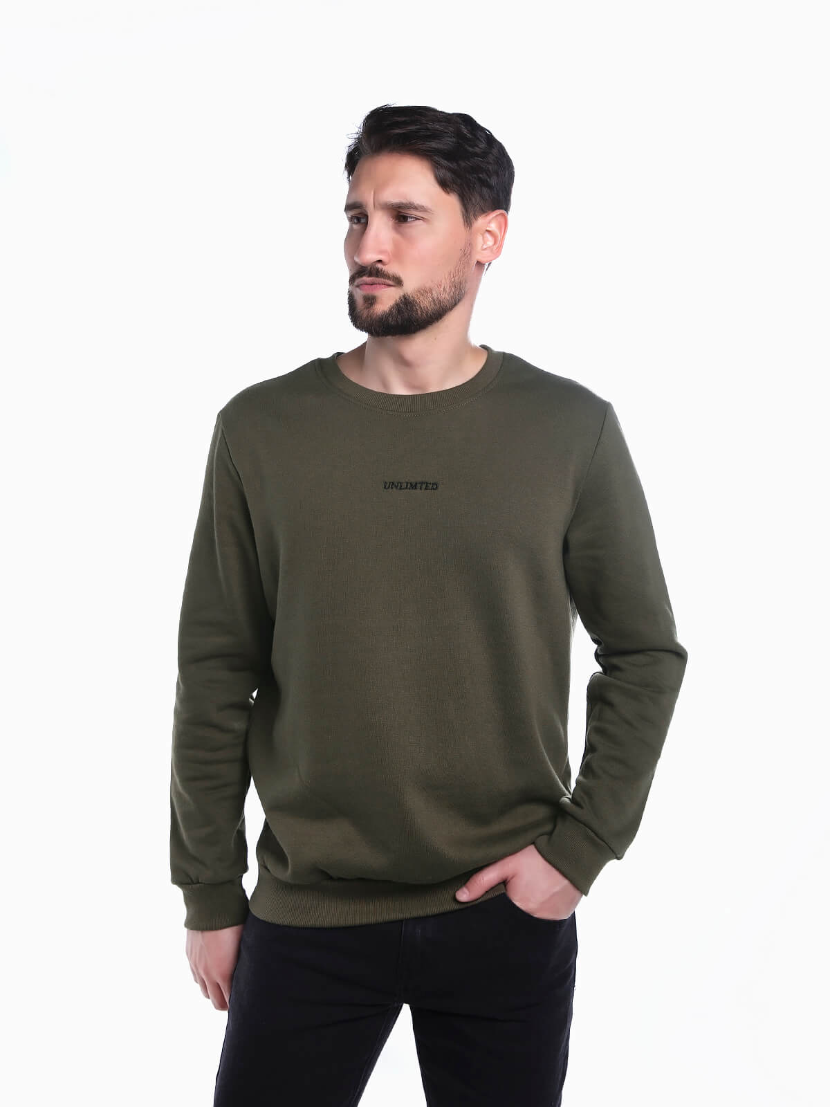 Sweatshirt verde tropa com letras bordadas no peito. Sweatshirt manga comprida com interior cardado. Gola redonda. Extremidades caneladas.