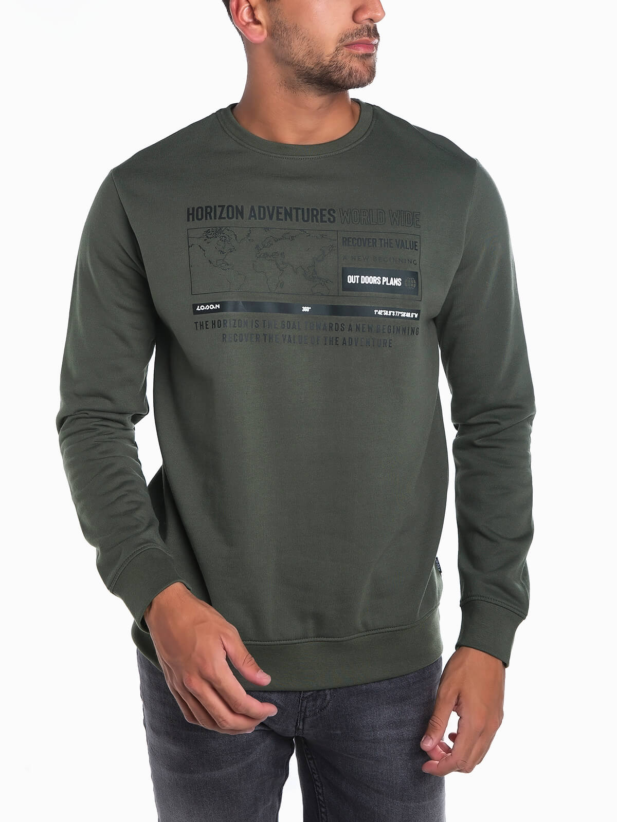 Sweatshirt verde tropa com imagem estampada no peito. Sweatshirt manga comprida com interior cardado. Gola redonda. Acabamentos elásticos.