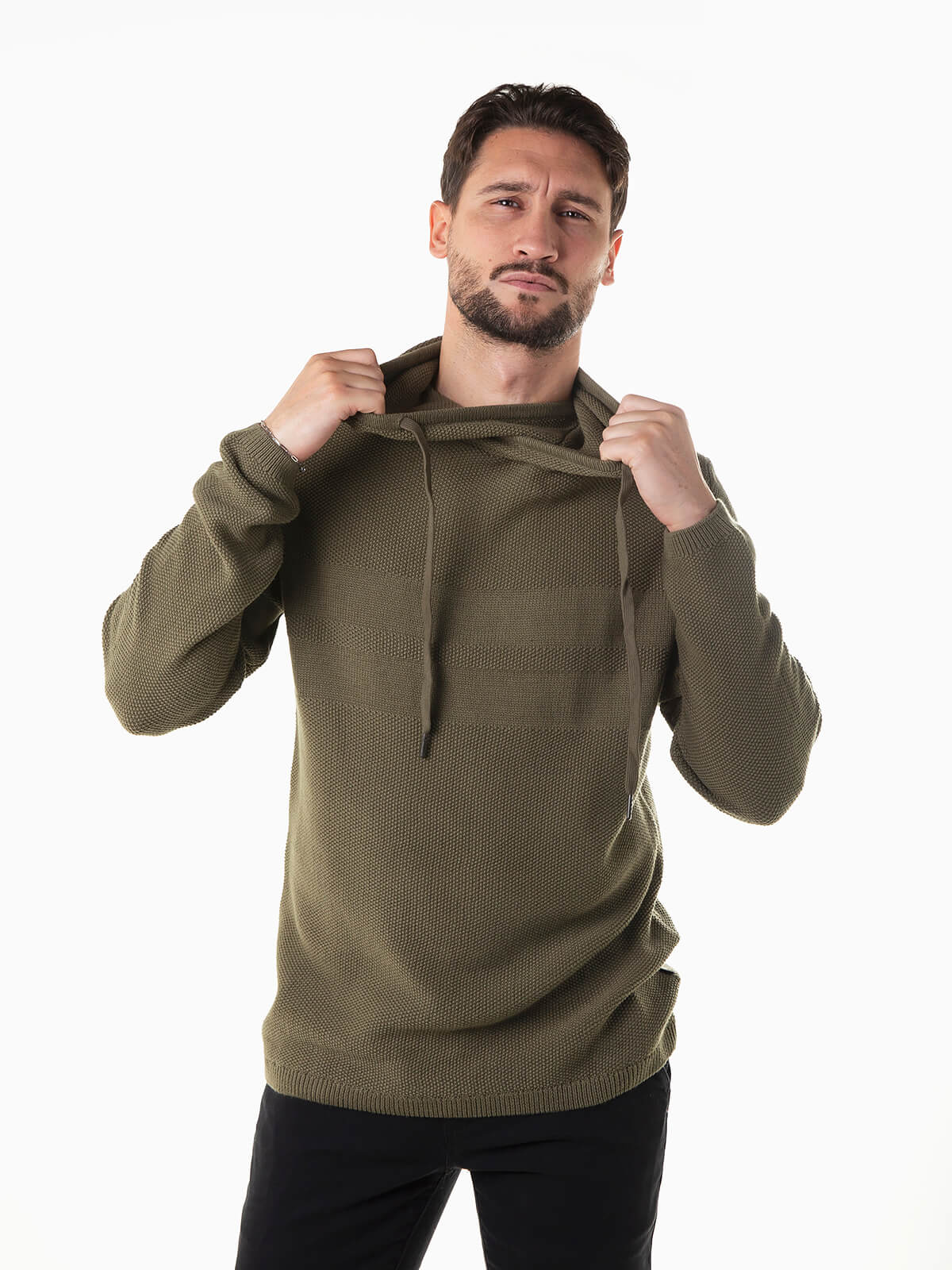 Sweatshirt verde tropa em malha 100% algodão com estrutura. Sweatshirt manga comprida com gola cruzada e cordão para ajustar. Acabamentos canelados.