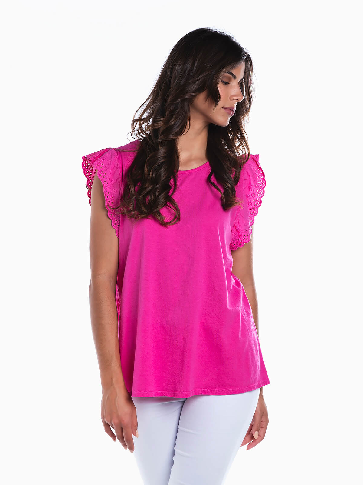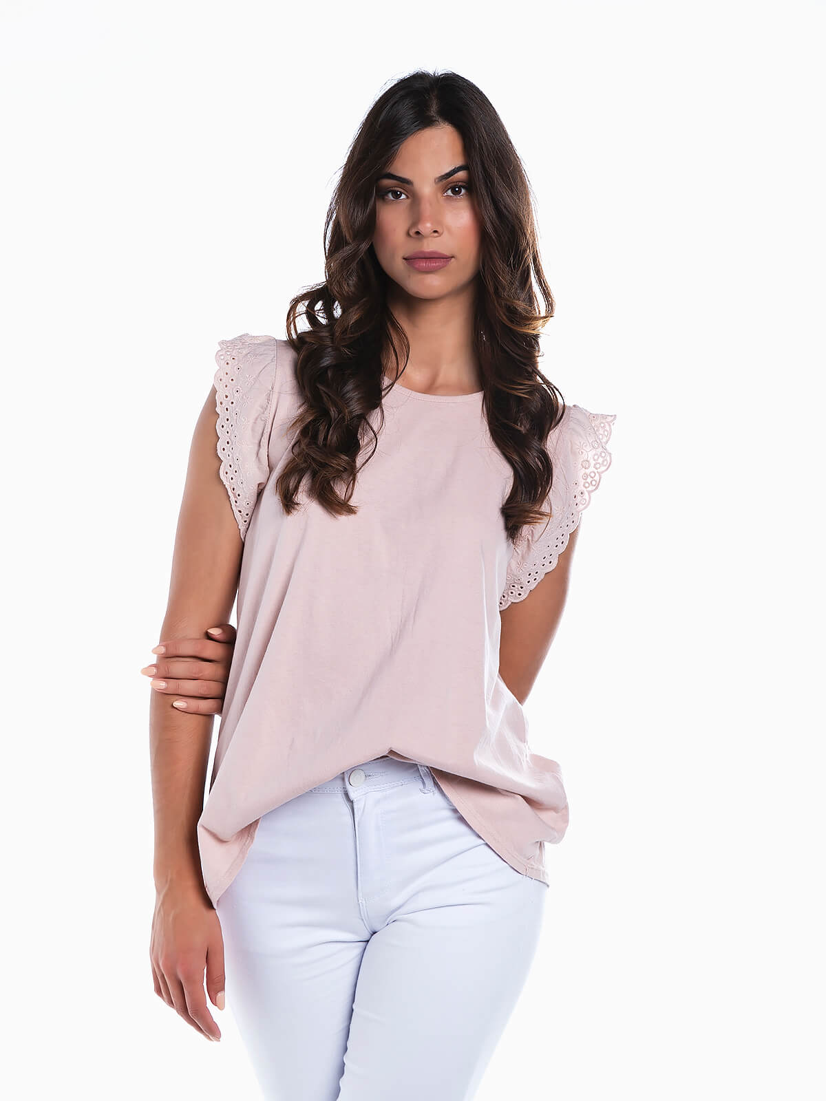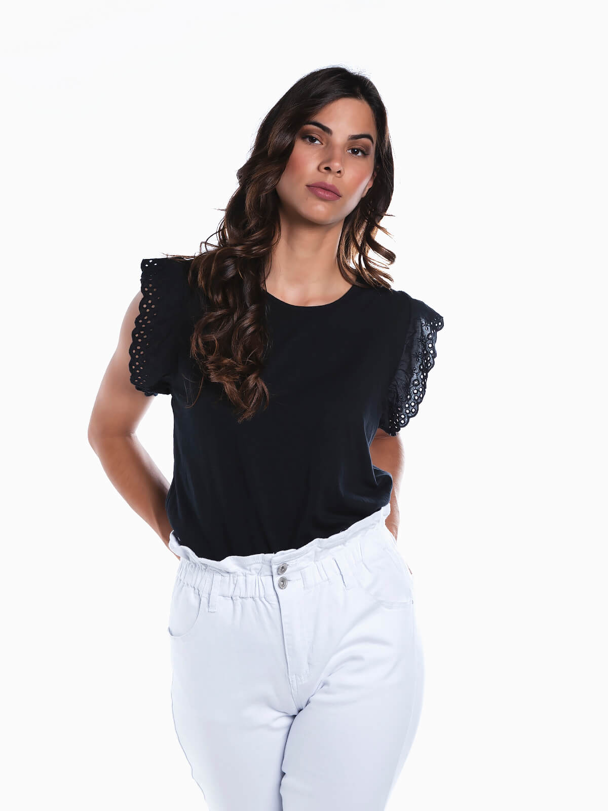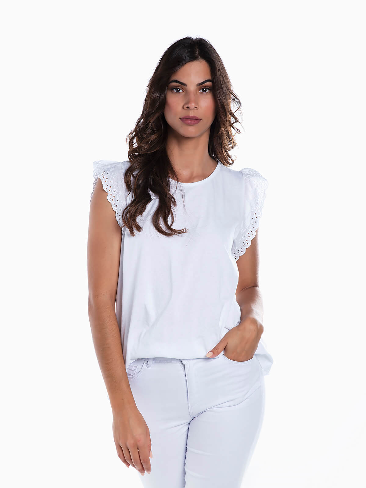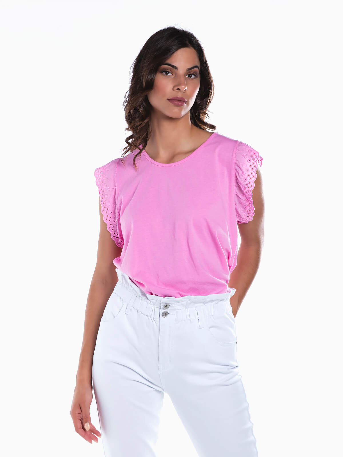 T-shirt algodão com detalhe em crochet nas costas. T-shirt sem mangas com folhos na cava. Gola redonda.