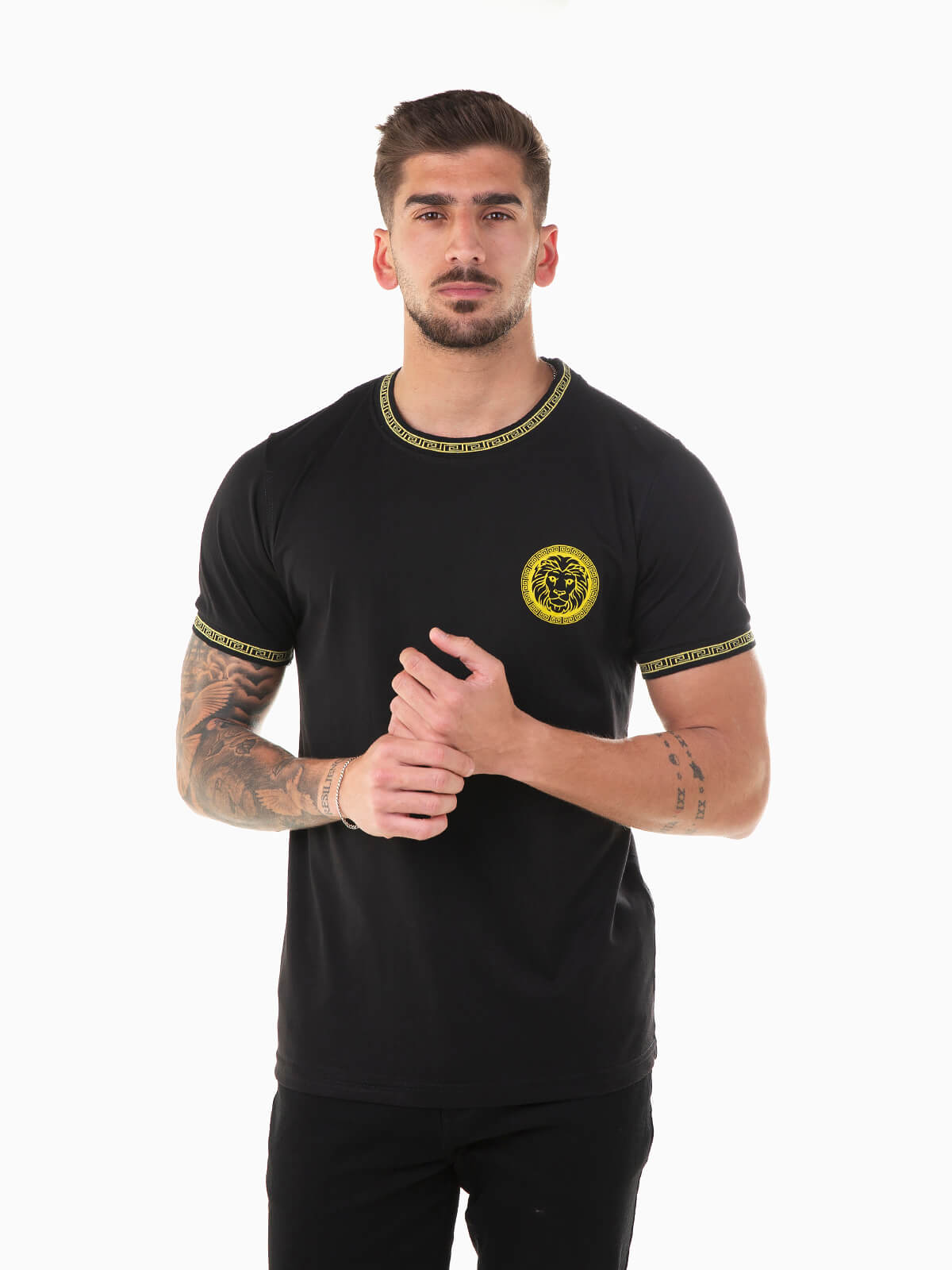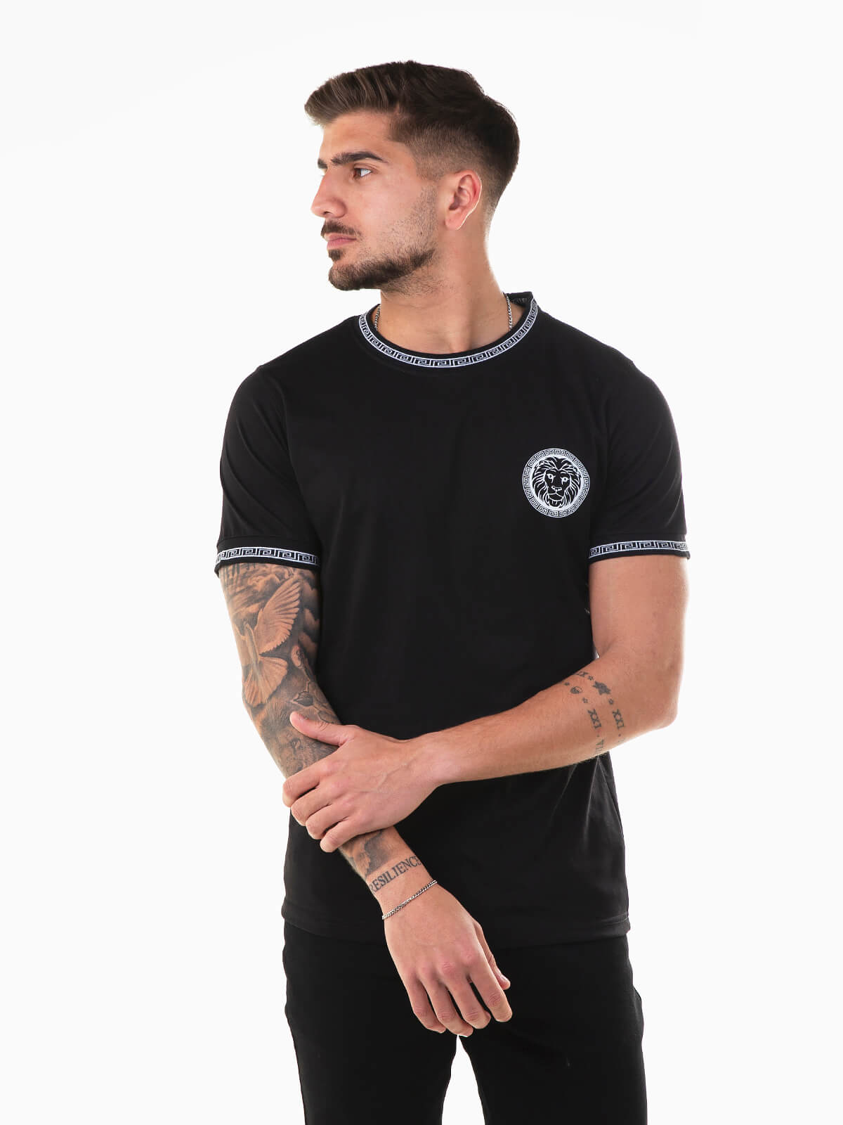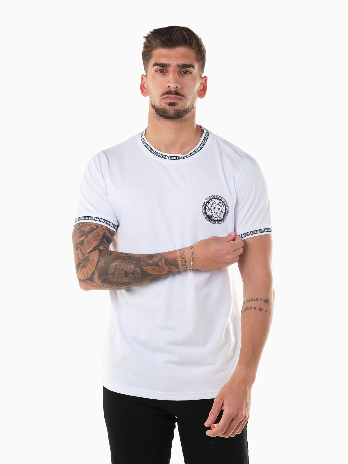 T-shirt confortável de algodão com estampado no peito e nas extremidades. T-shirt manga curta para homem com gola redonda.
