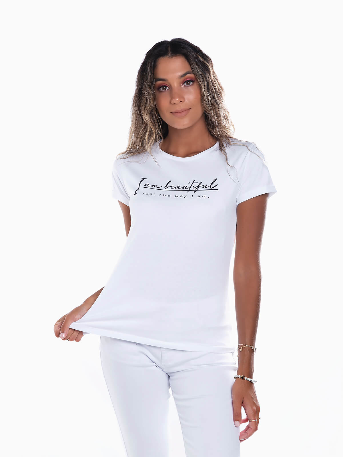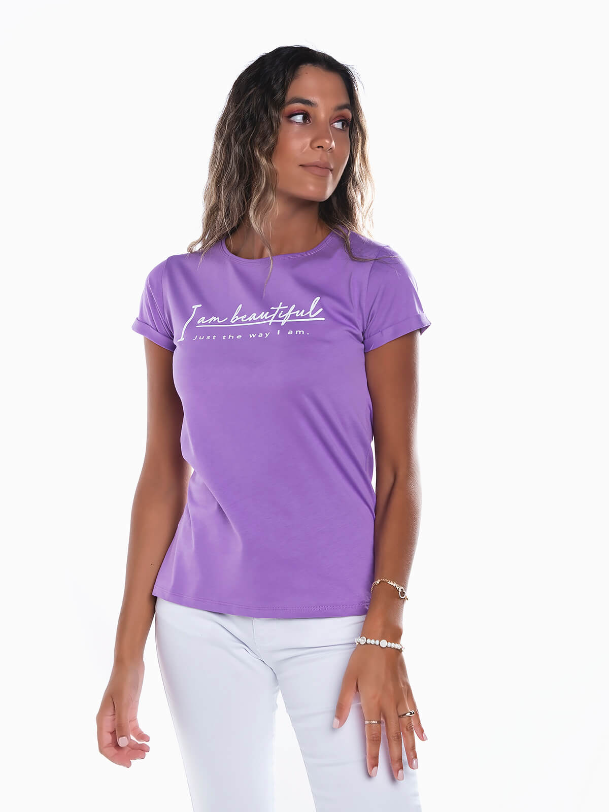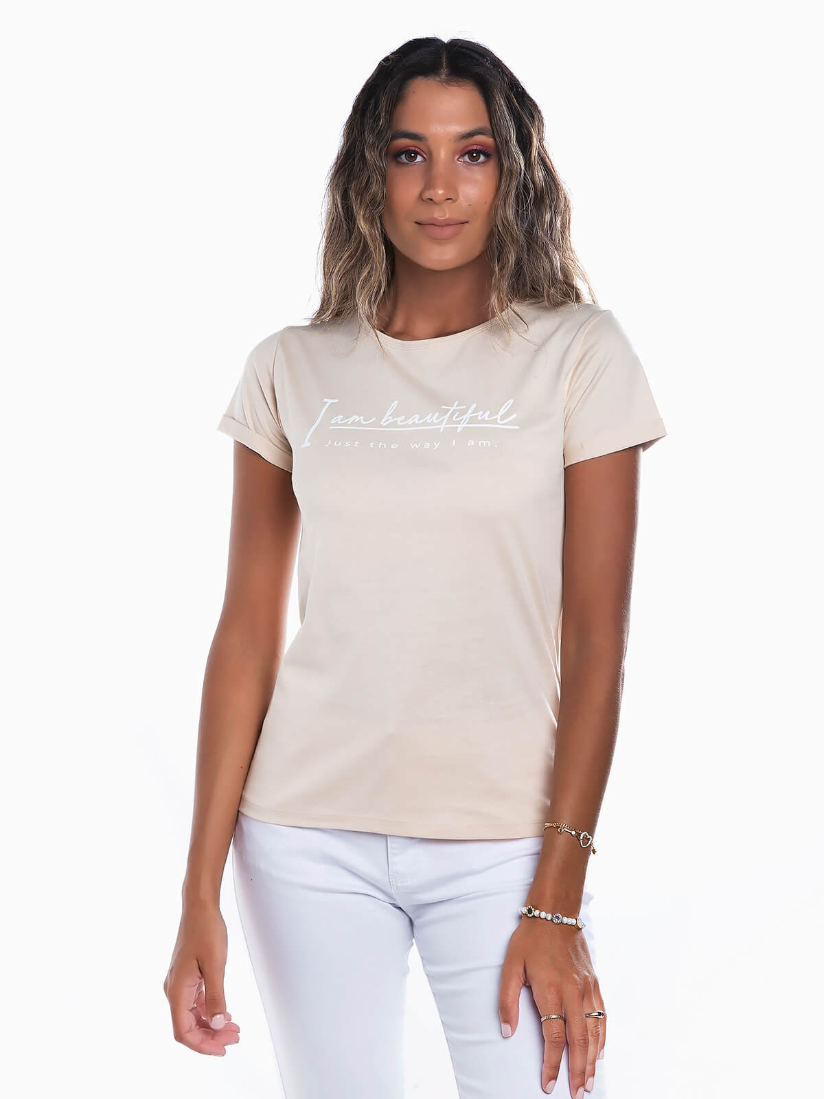 T-shirt de manga curta dobrada em tecido 100% algodão. T-shirt com estampado de letras no peito e decote redondo.