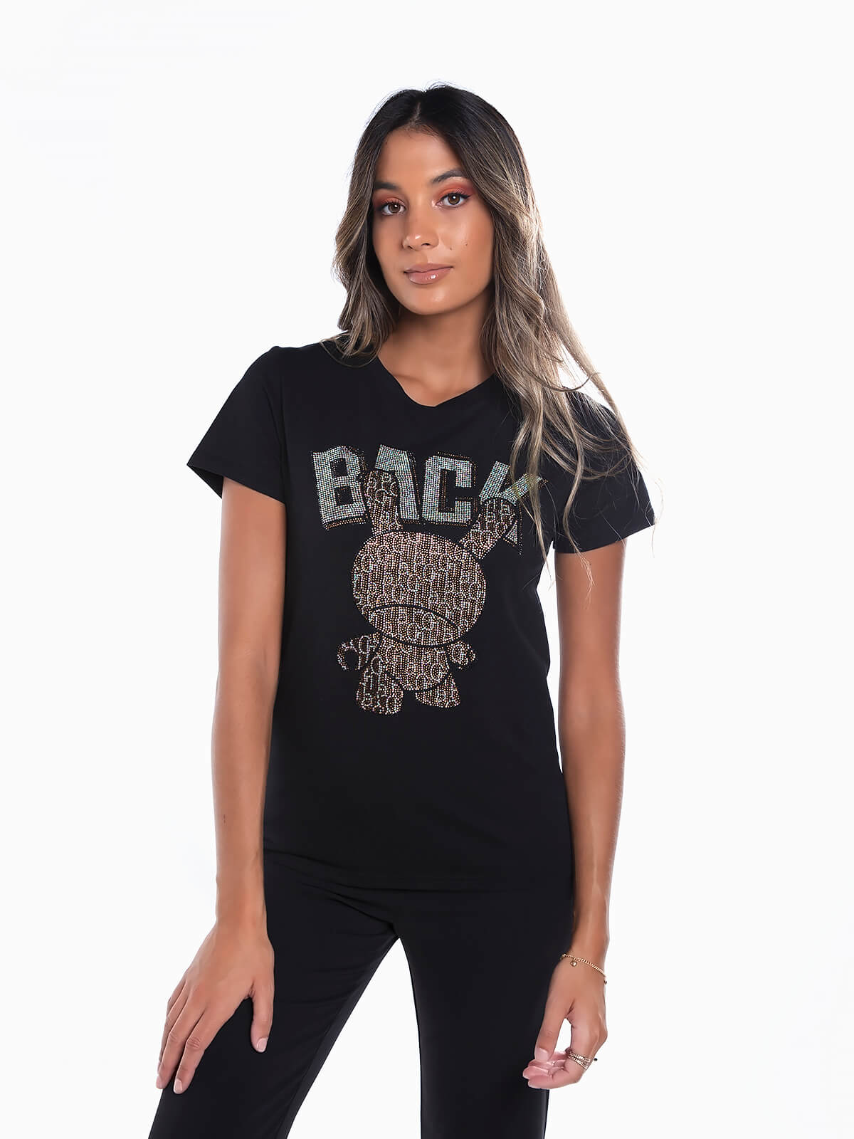 T-shirt em tecido 100% algodão com estampado de urso e letras em brilhos. T-shirt de manga curta com decote redondo.