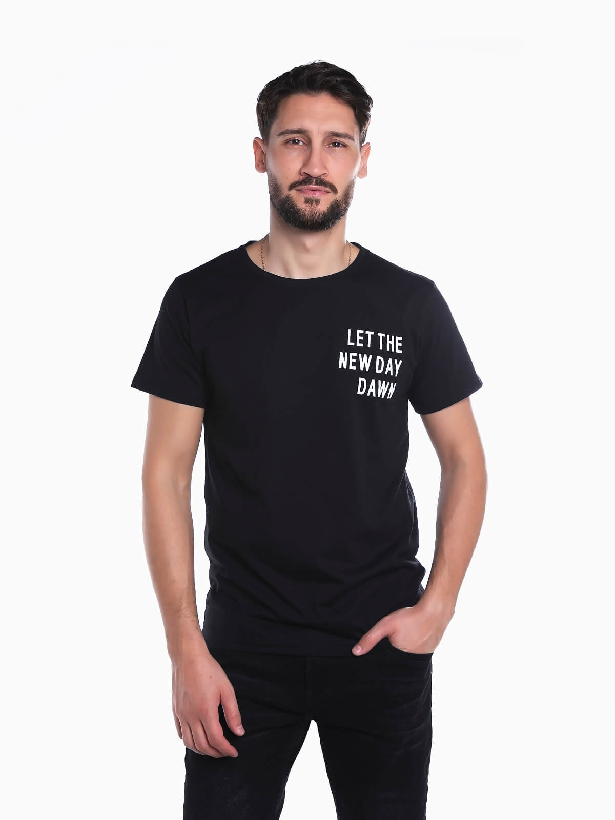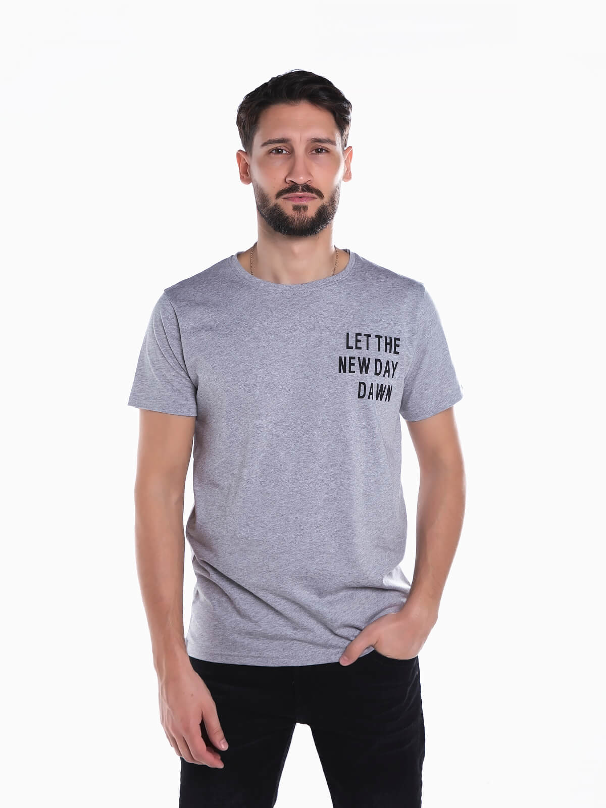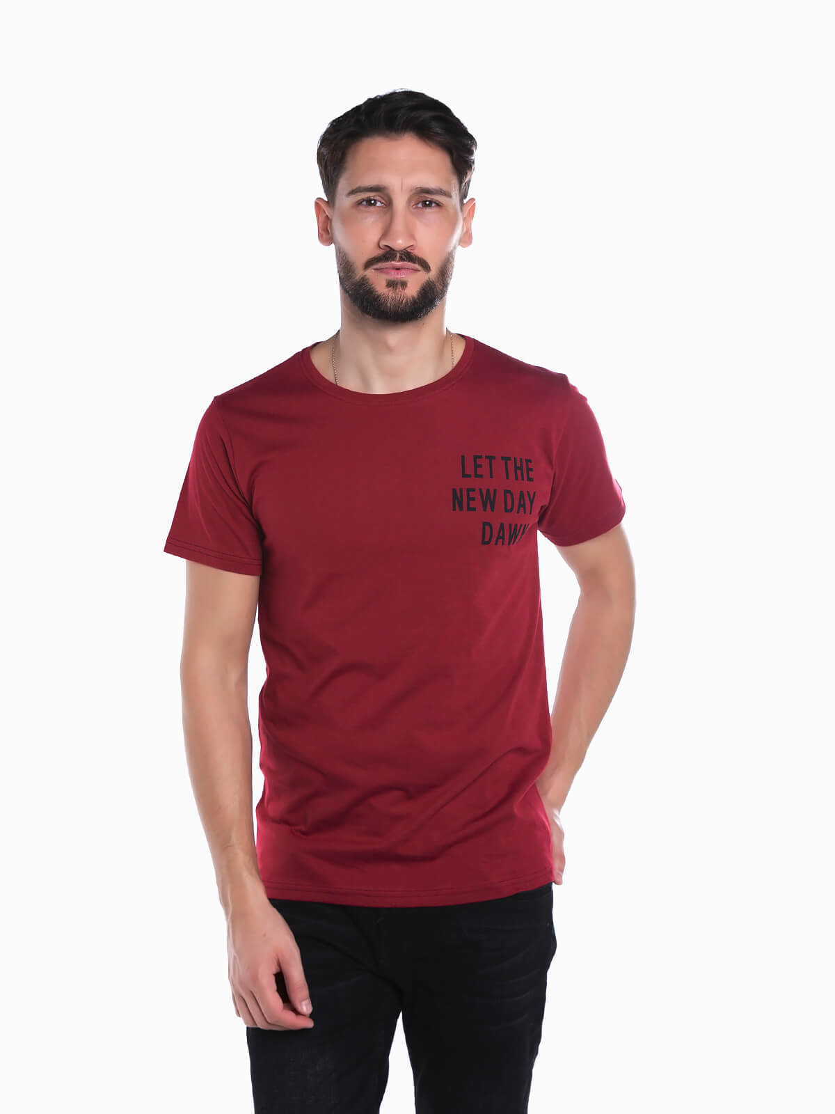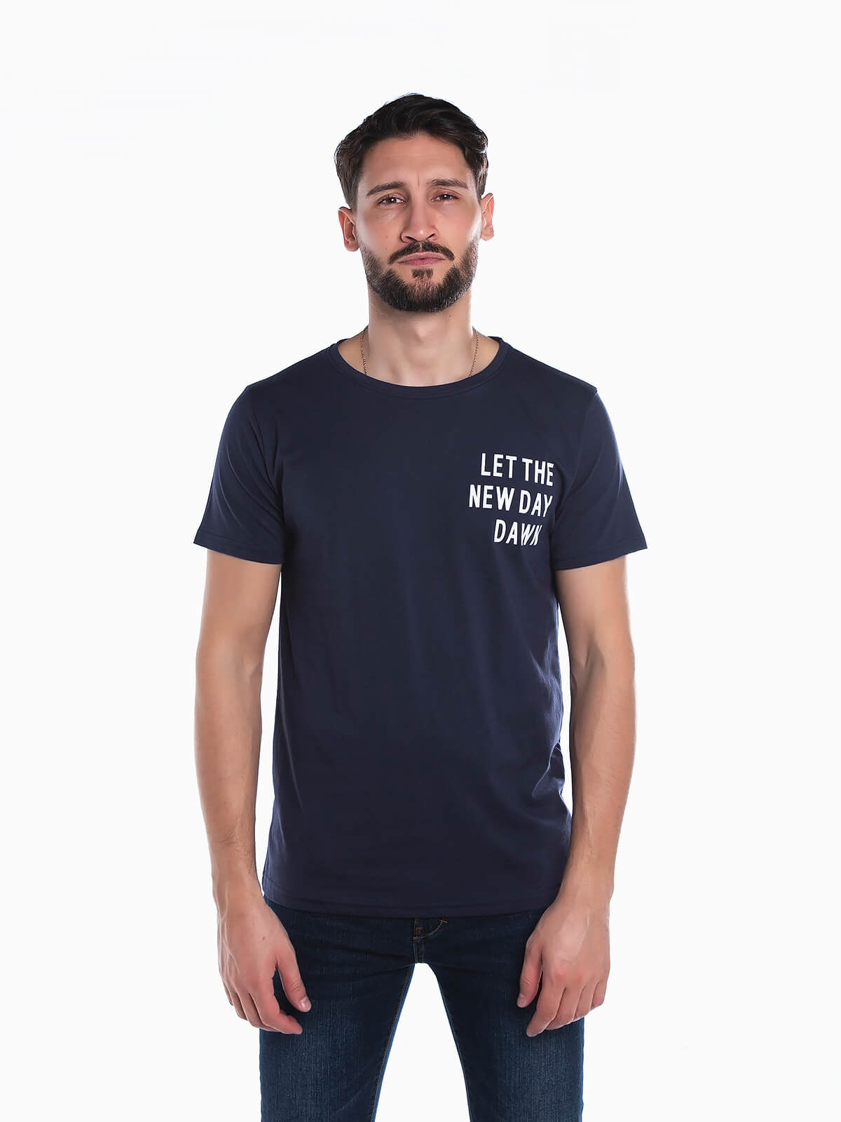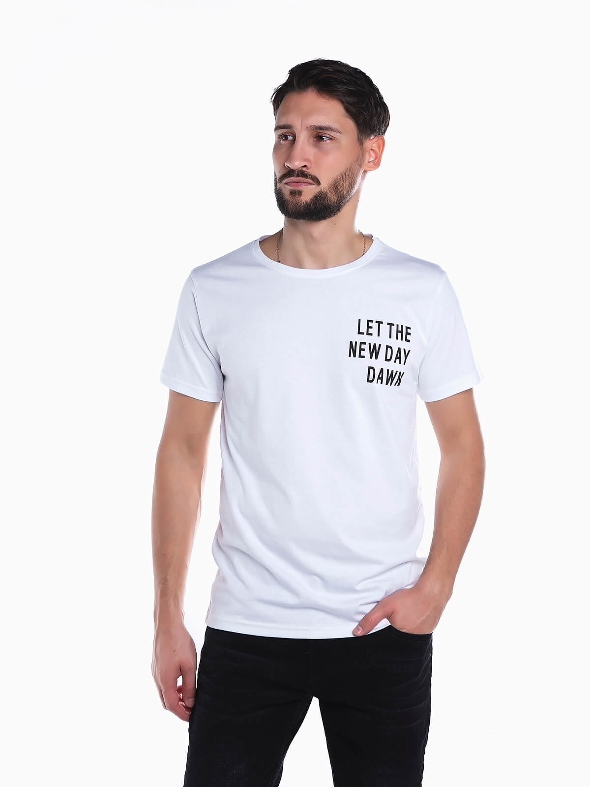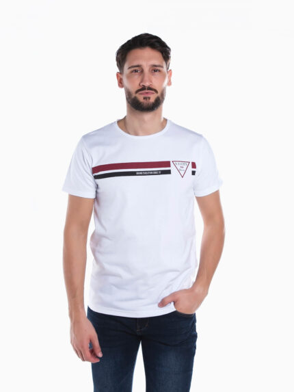 T-shirt em tecido 100% algodão de manga curta para homem. T-shirt com estampado de letras no peito. Gola redonda.