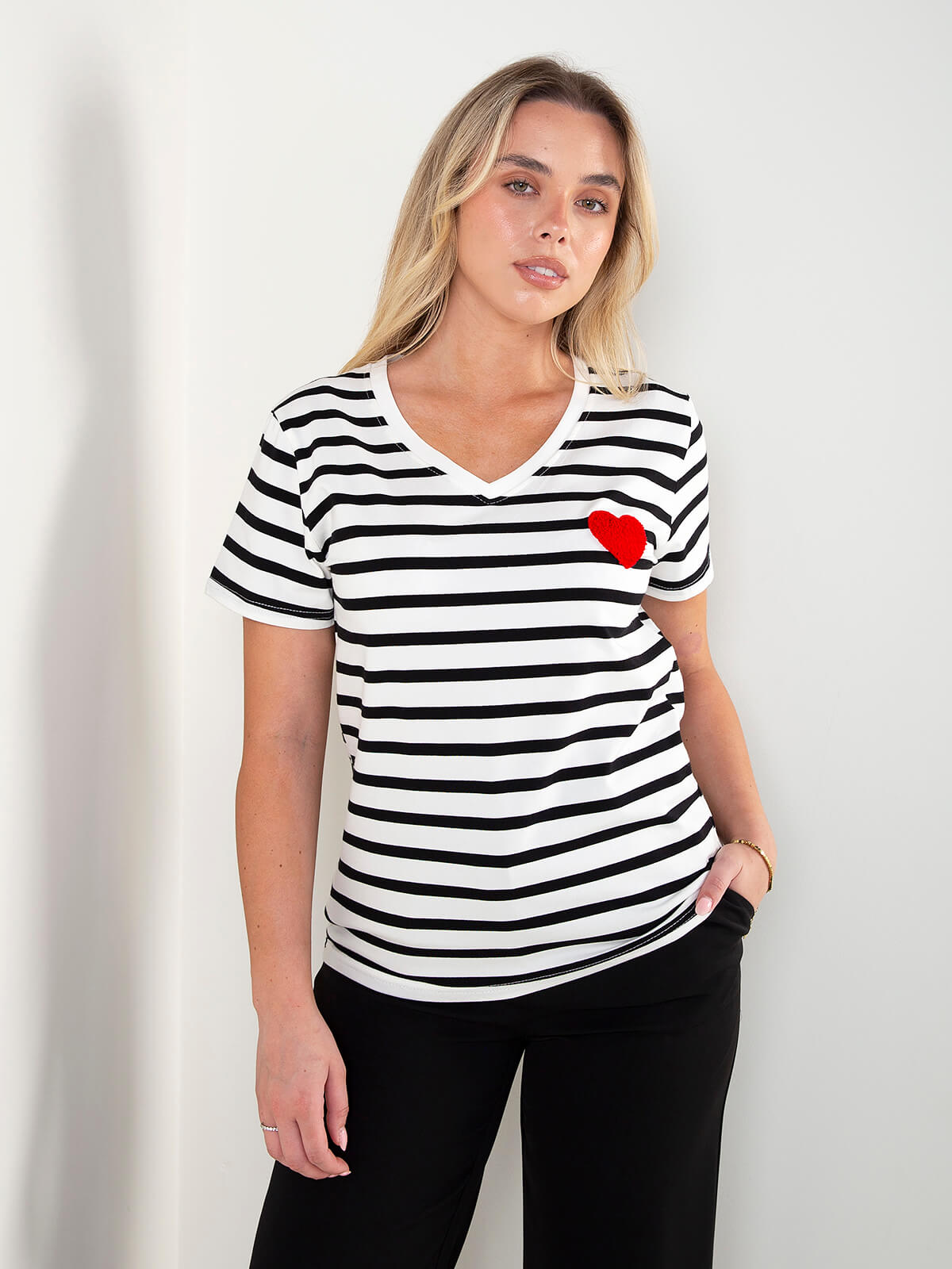 T-shirt de manga curta às riscas com decote em v e bordado de coração no peito. Modelo confortável e versátil, ideal para looks casuais do dia a dia.