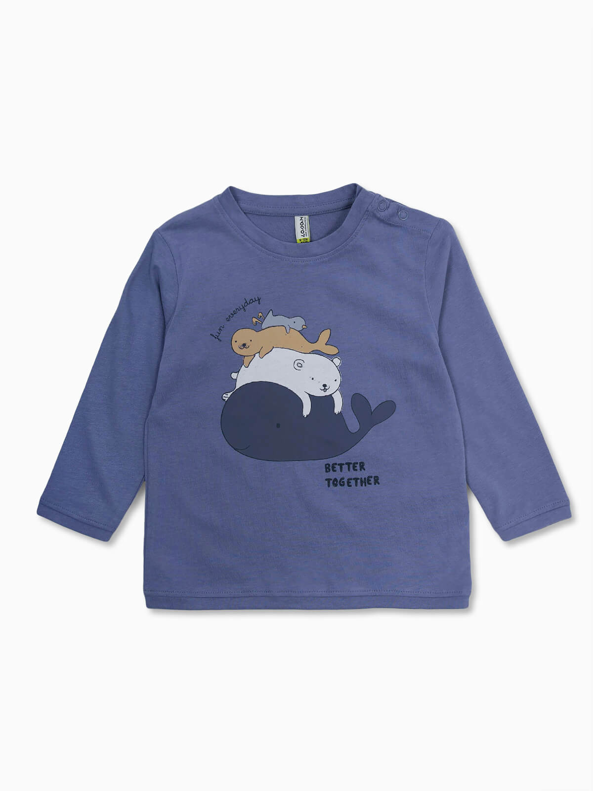 T-shirt azul de manga comprida com animais estampados para bebé menino. T-shirt 100% algodão com decote redondo e aperto lateral botões de pressão.