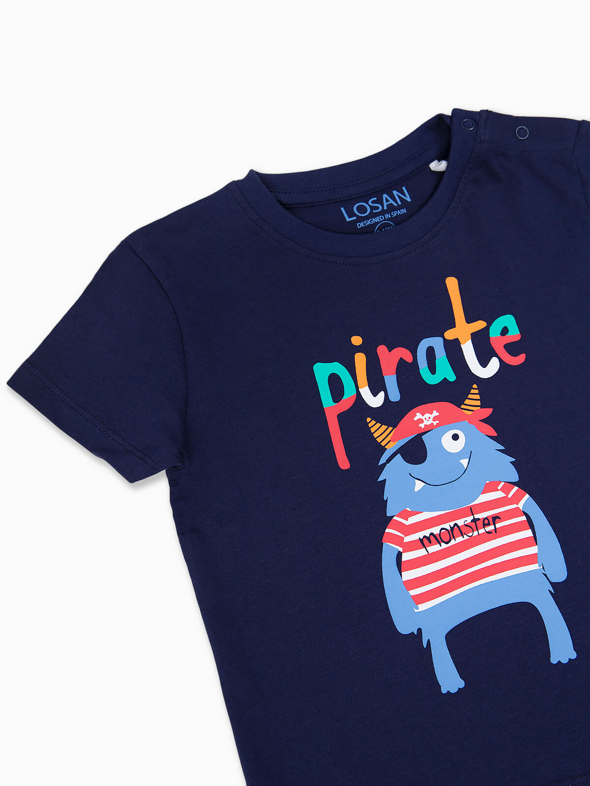 T-shirt azul marinho com estampado de pirata no peito para bebé menino. T-shirt em 100% algodão de manga curta com gola redonda. Aperto de dois botões de pressão.
