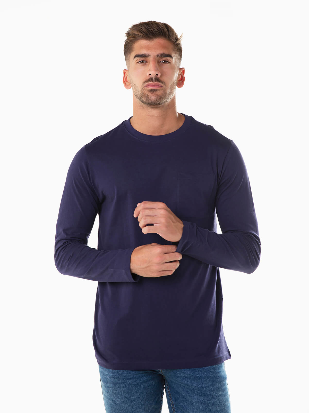T-shirt azul marinho de manga comprida com bolso no peito. Long sleeve para homem confeccionada em tecido 100% algodão para maior conforto. Gola redonda.