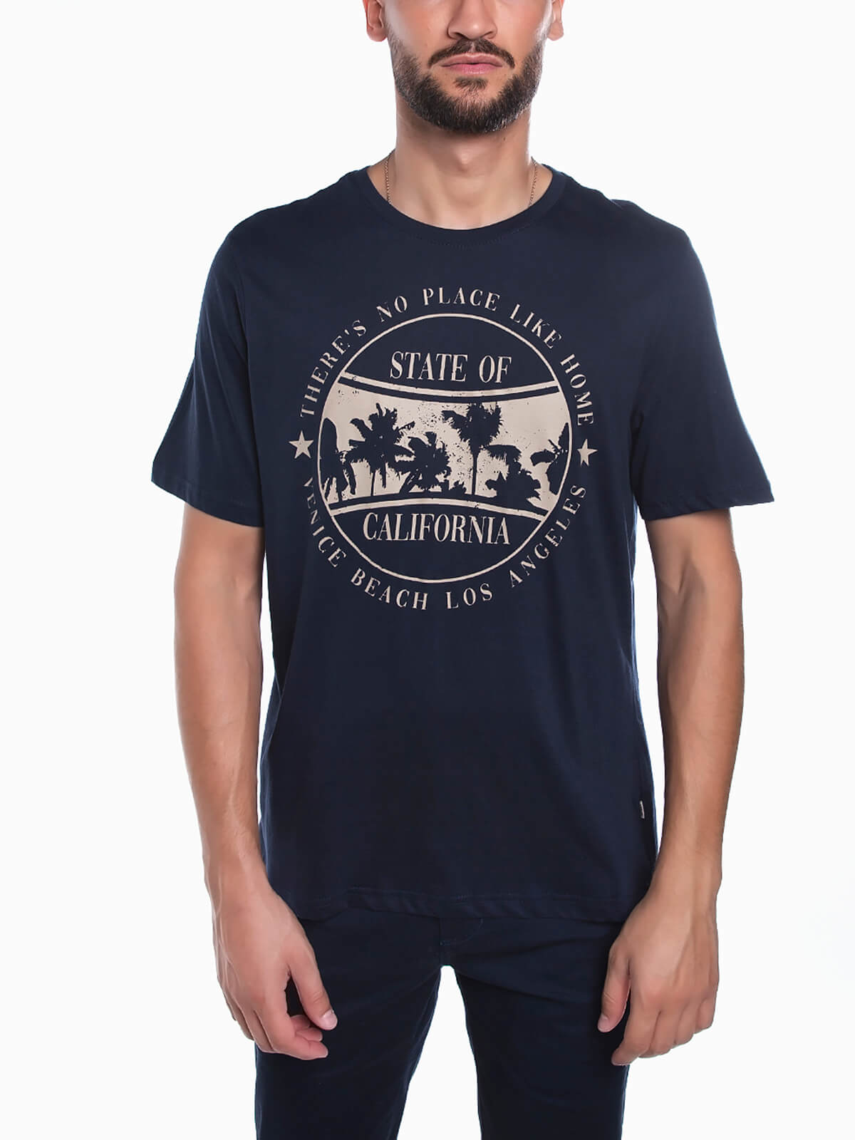 T-shirt azul marinho de manga curta com círculo estampado e letras. T-shirt em tecido 100% algodão com gola redonda.