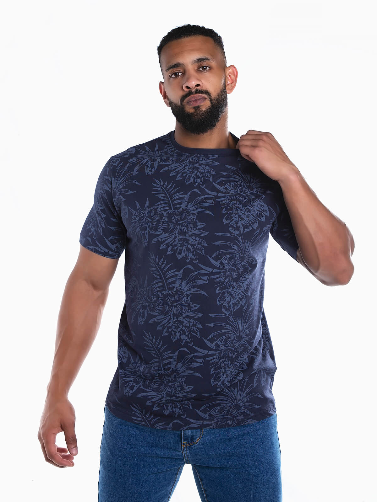 T-shirt azul marinho de manga curta com estampado de flores e folhas. T-shirt para homem 100% algodão com gola redonda.