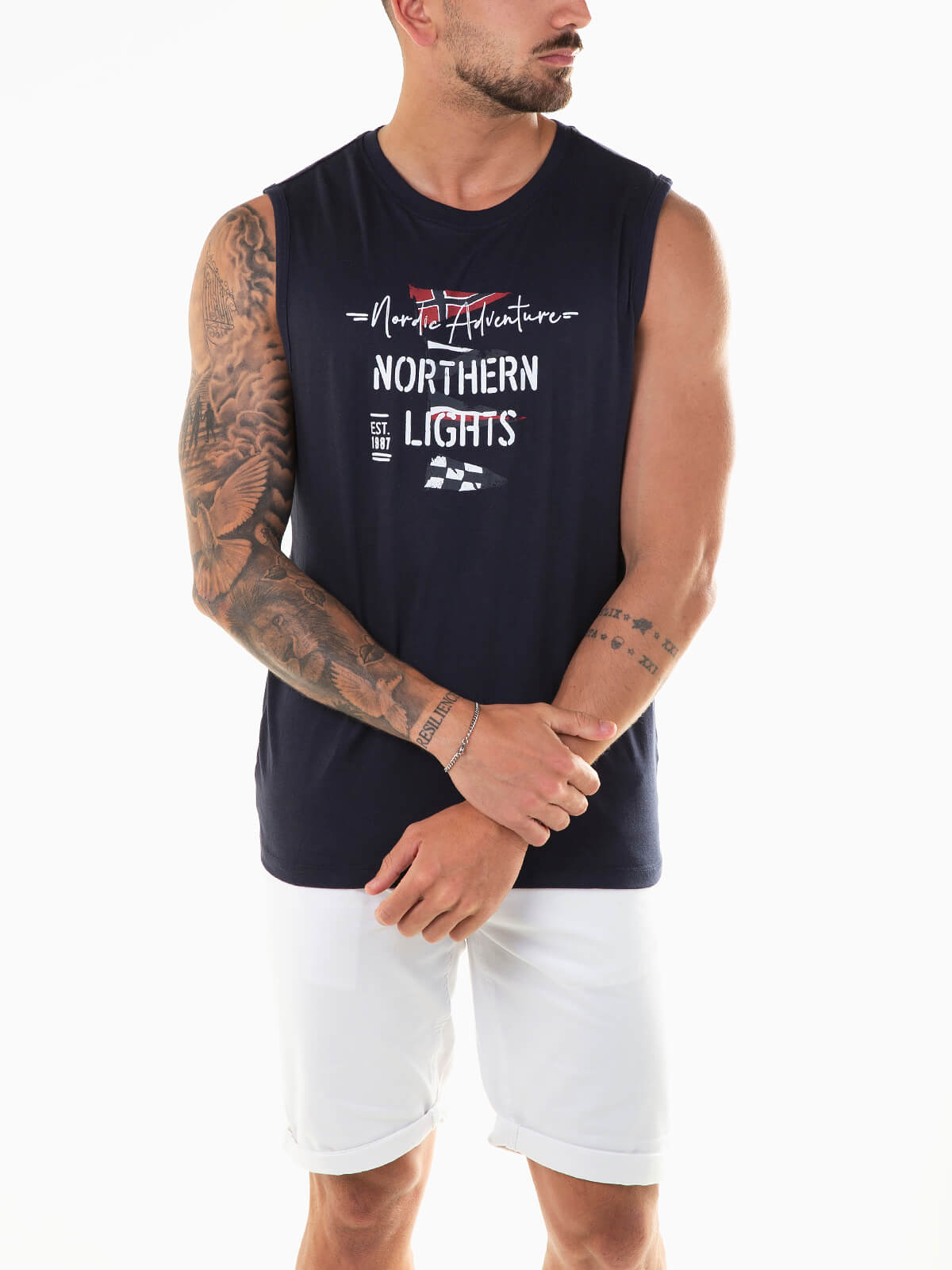 T-shirt azul marinho sem mangas para homem. T-shirt 100% algodão com estampado e gola redonda.