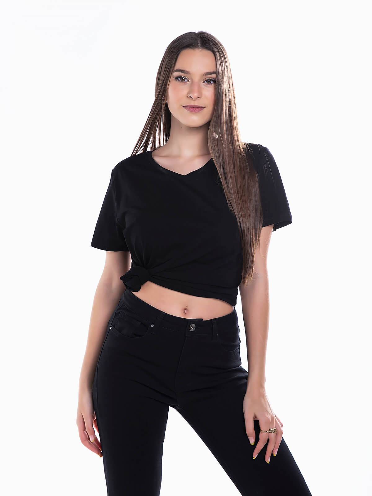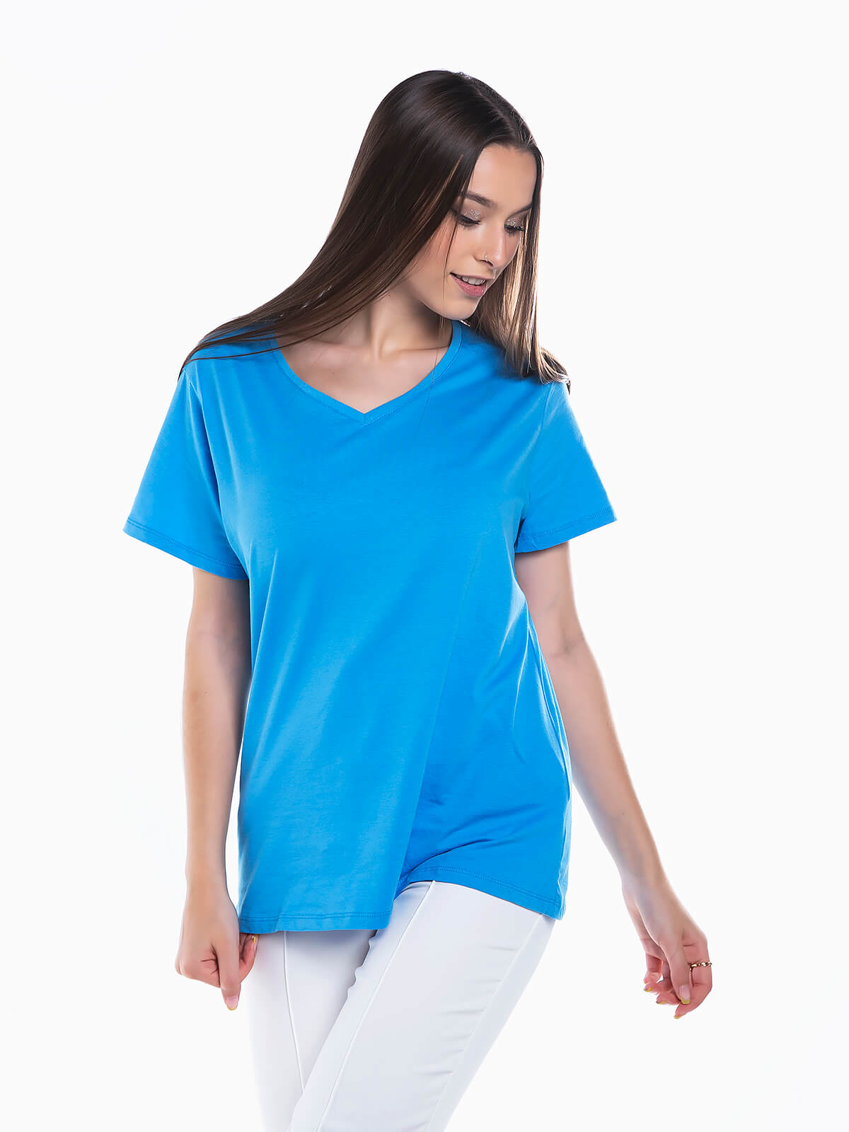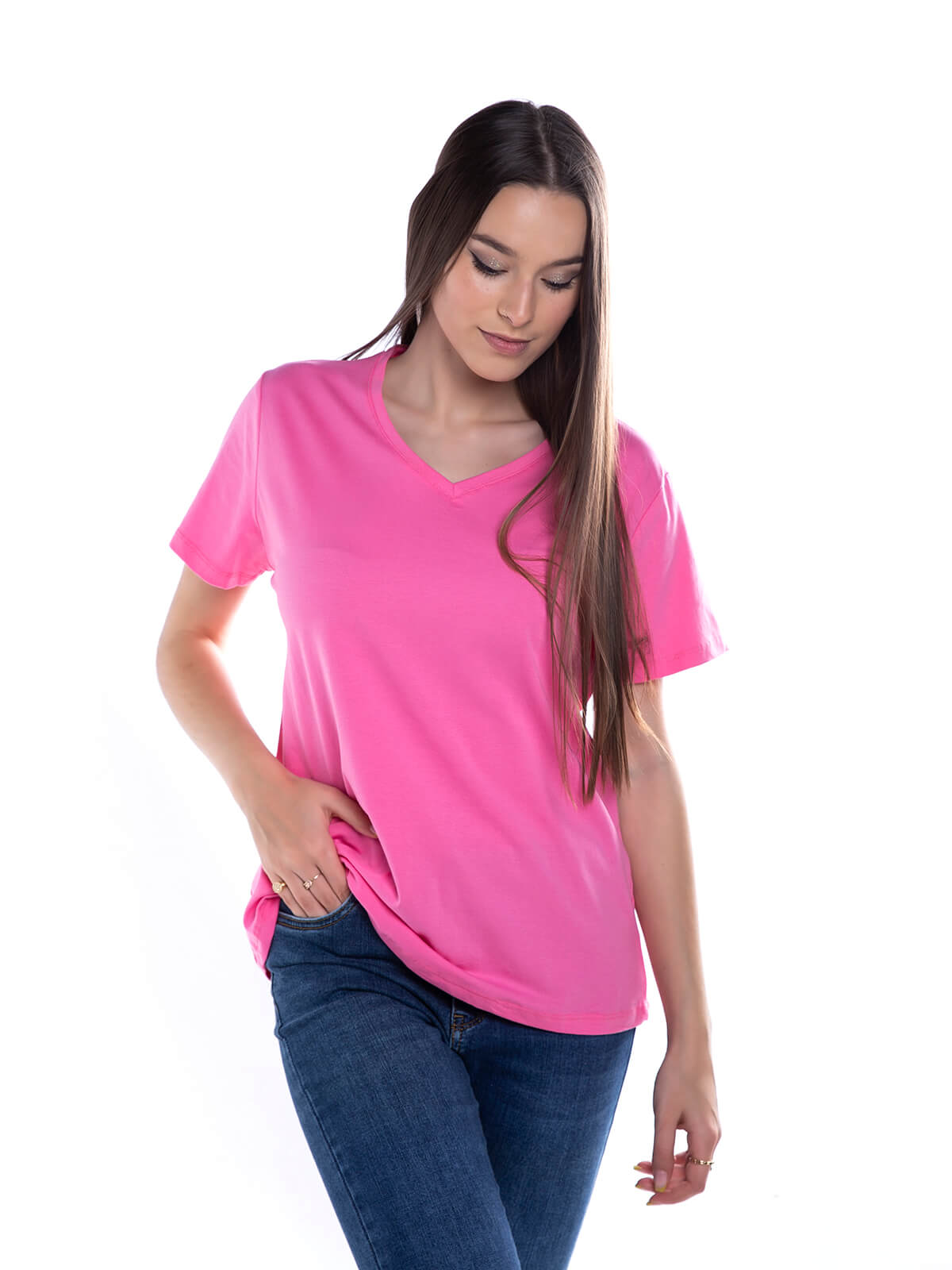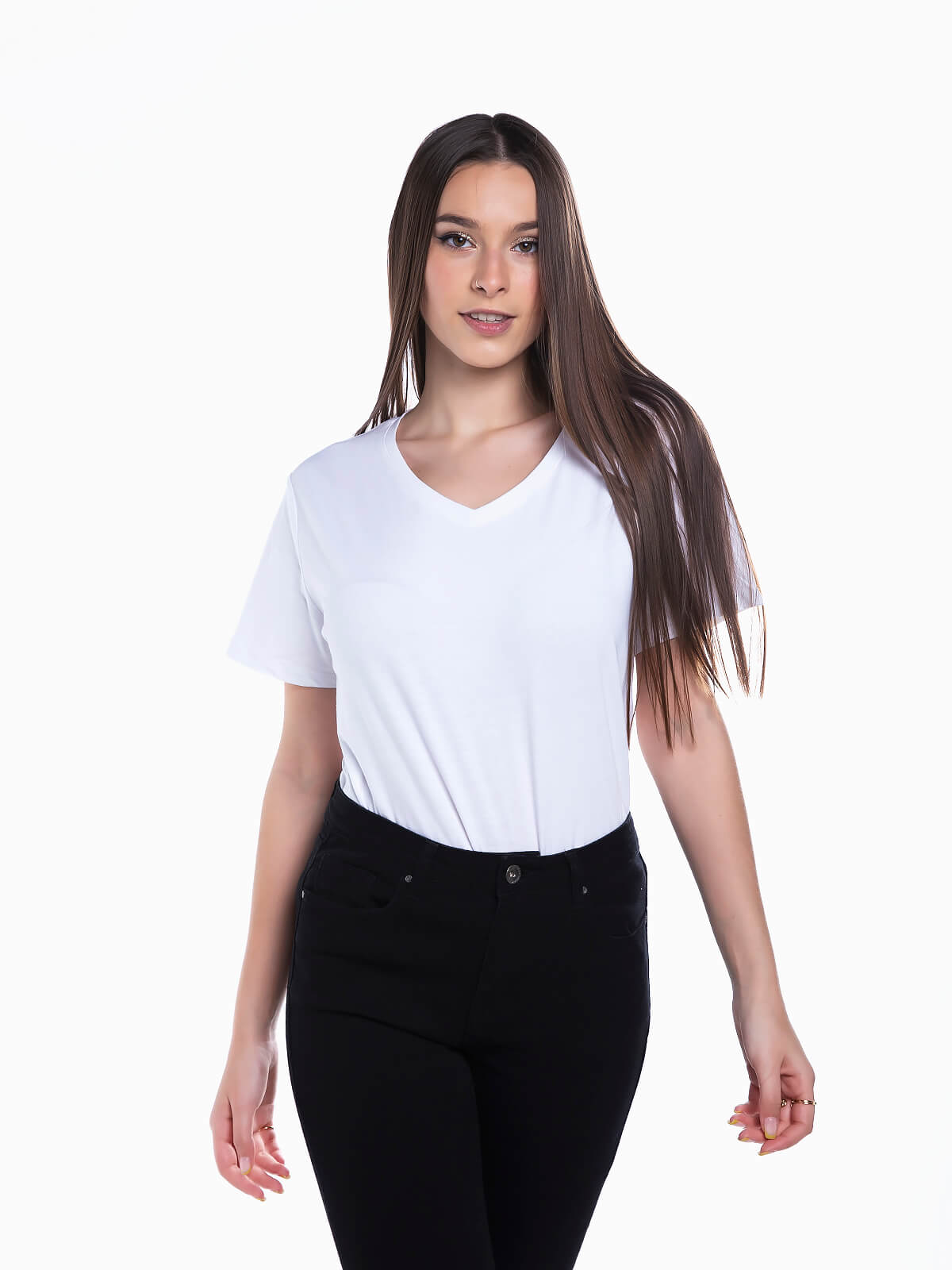 T-shirt básica com decote em V para senhora. T-shirt em algodão de manga curta.