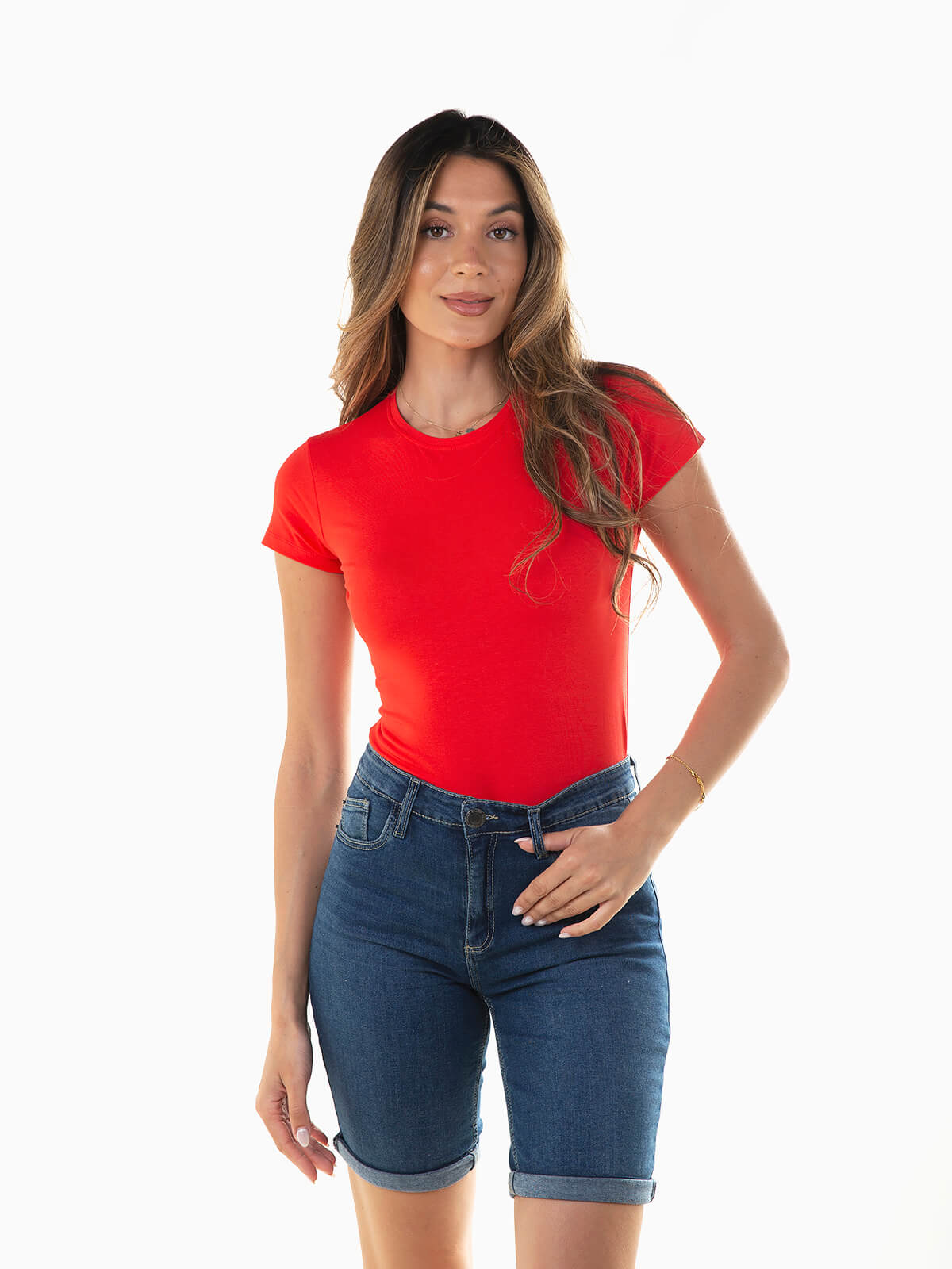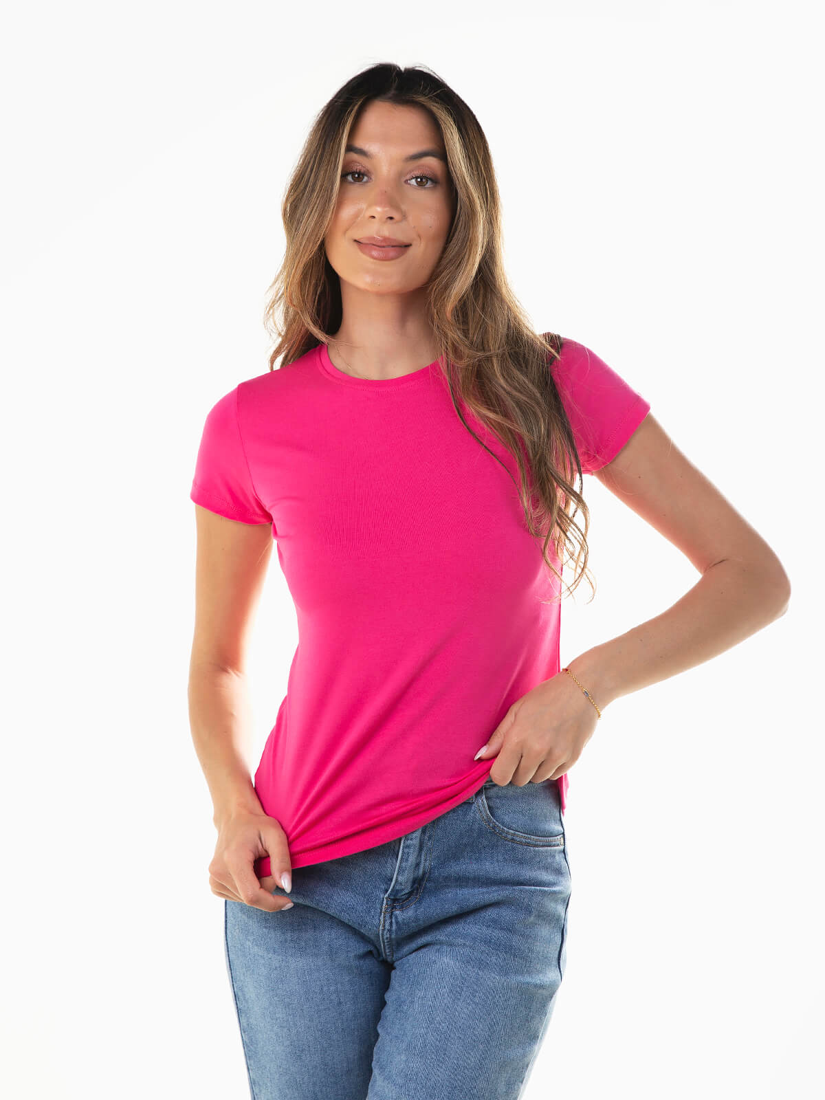 T-shirt básica de manga curta para mulher. T-shit confortável de algodão com decote redondo. Perfeita para complementar qualquer look.