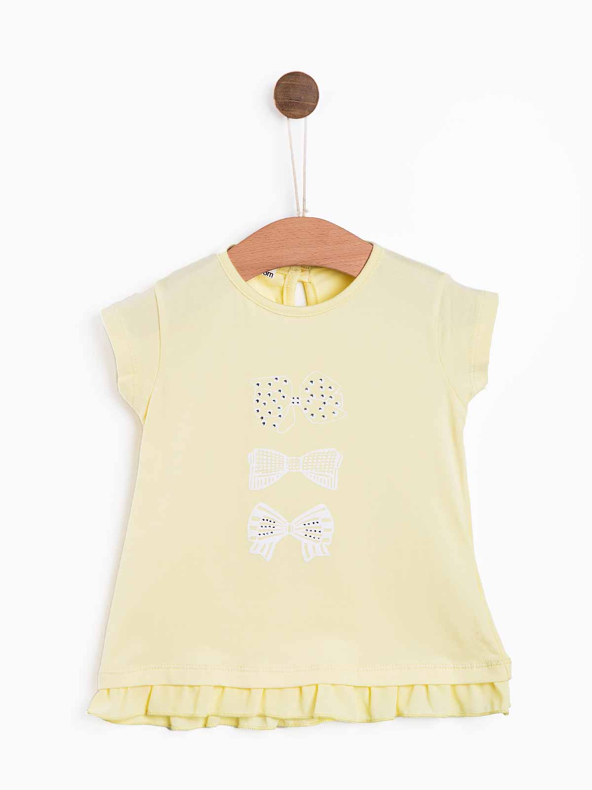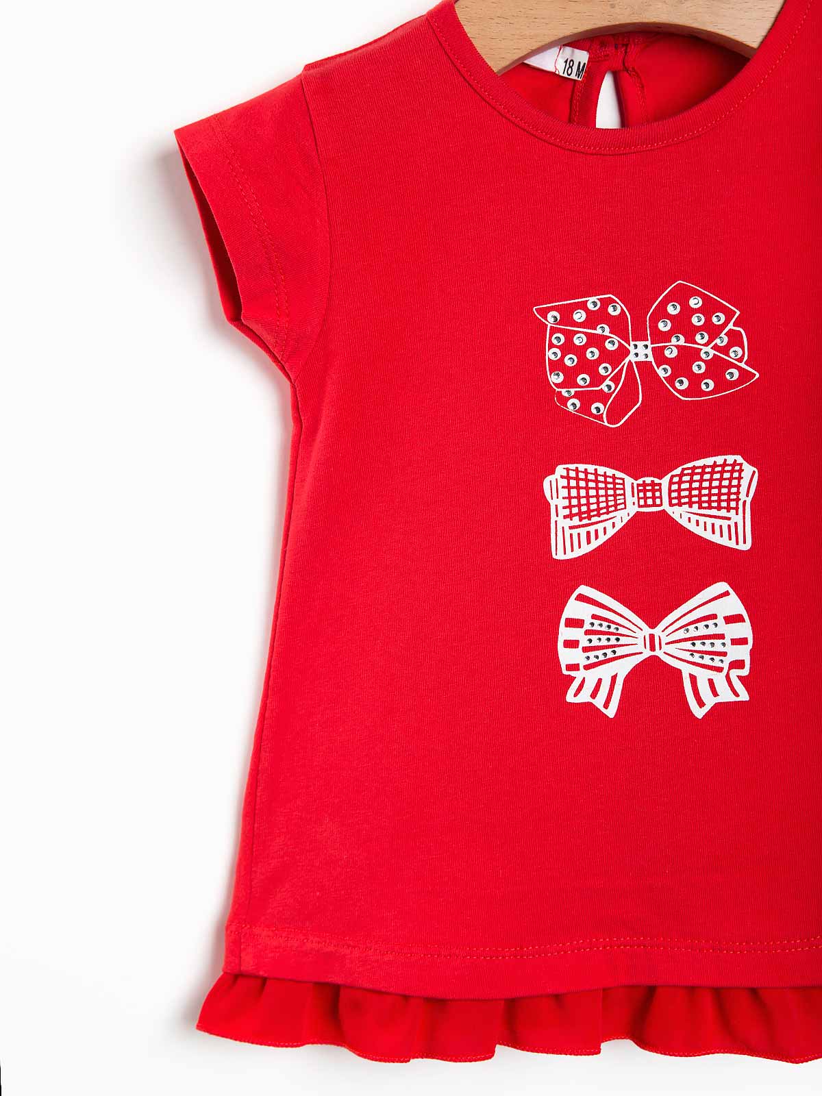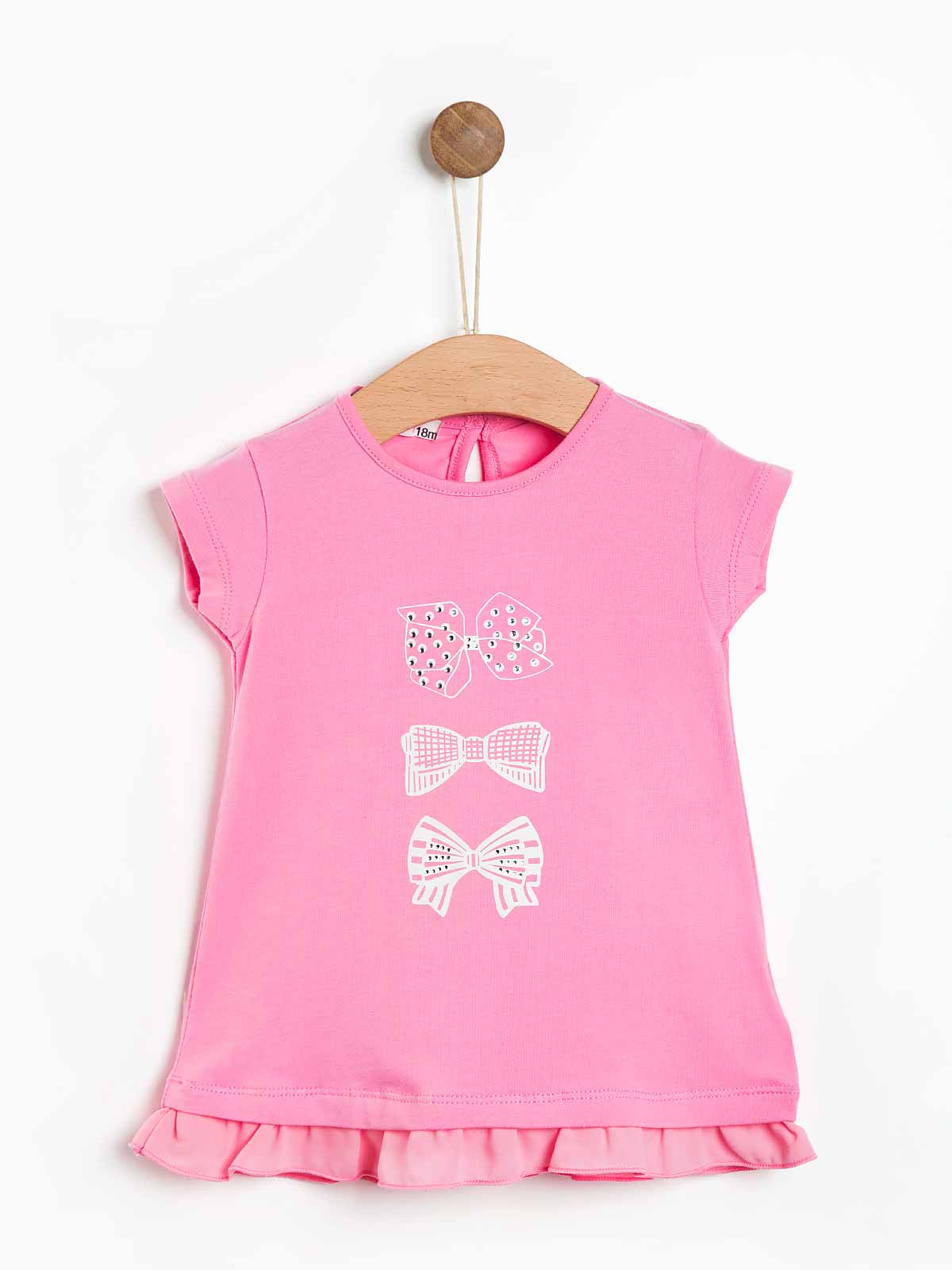 T-shirt bebé menina com laços estampados e folho em baixo.
