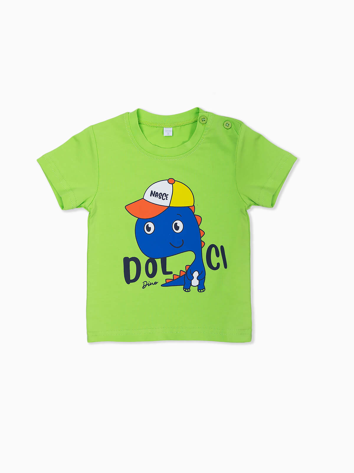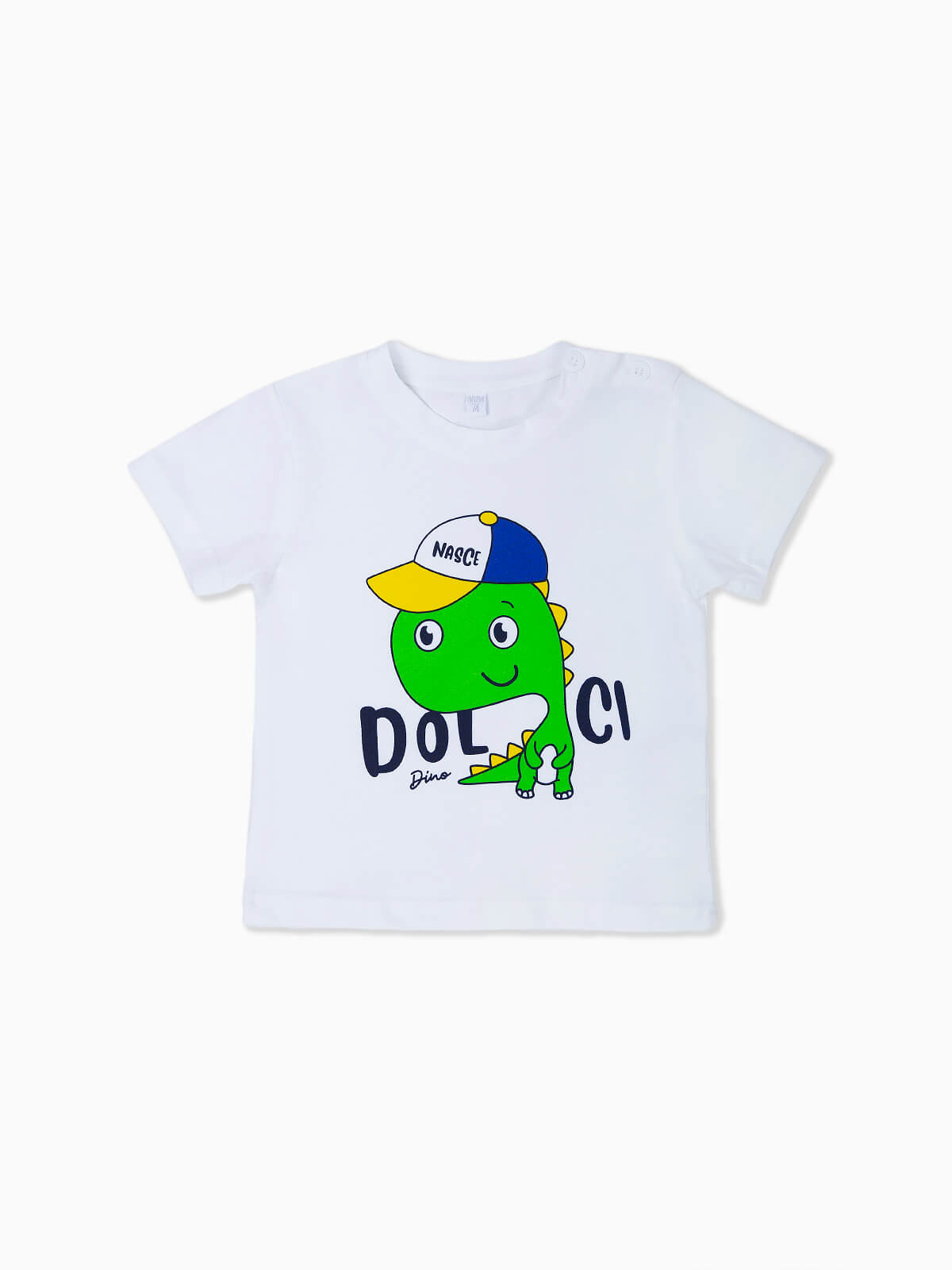T-shirt para bebé menino com estampado dinossauro e letras. T-shirt de manga curta de gola redonda com aperto de 2 botões.