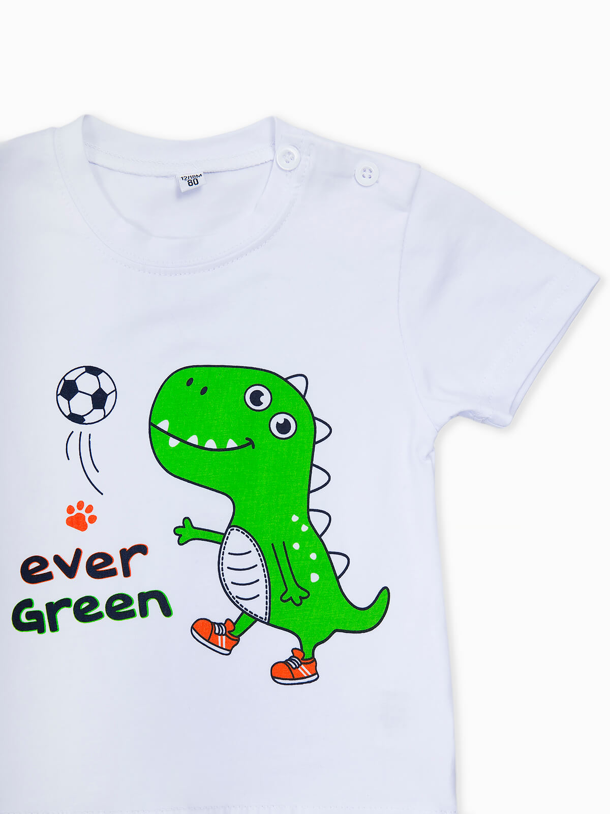 T-shirt para bebé menino com estampado de dinossauro. T-shirt de manga curta com gola redonda e aperto de 2 botões.