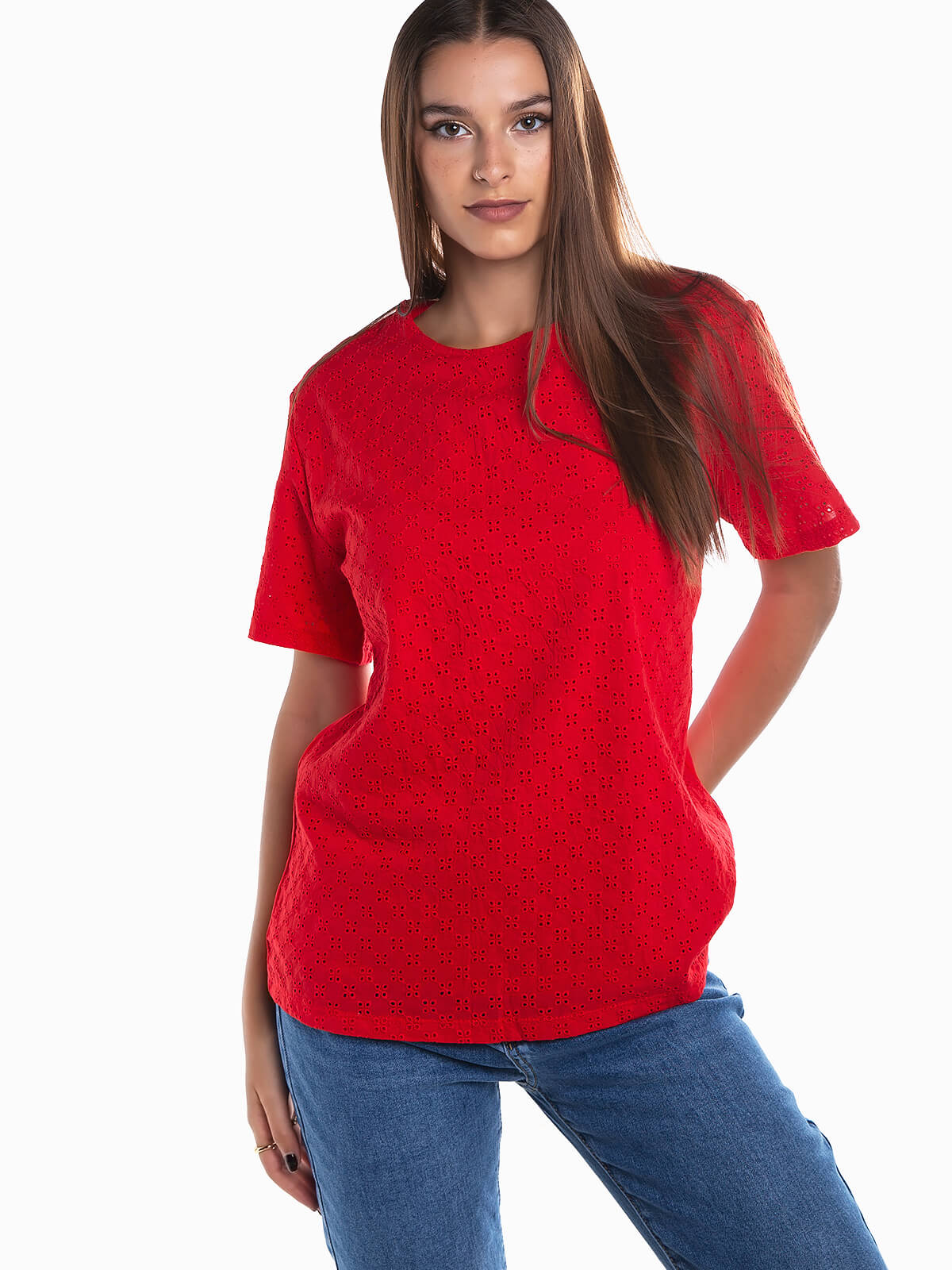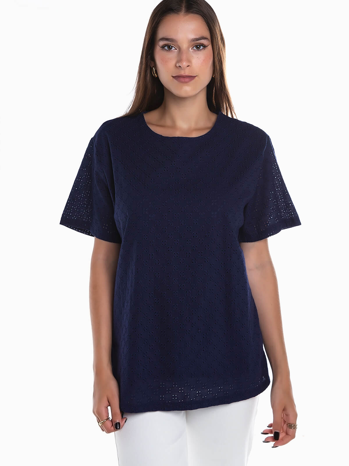 T-shirt para senhora em tecido bordado inglês frontal. T-shirt manga curta com gola redonda.