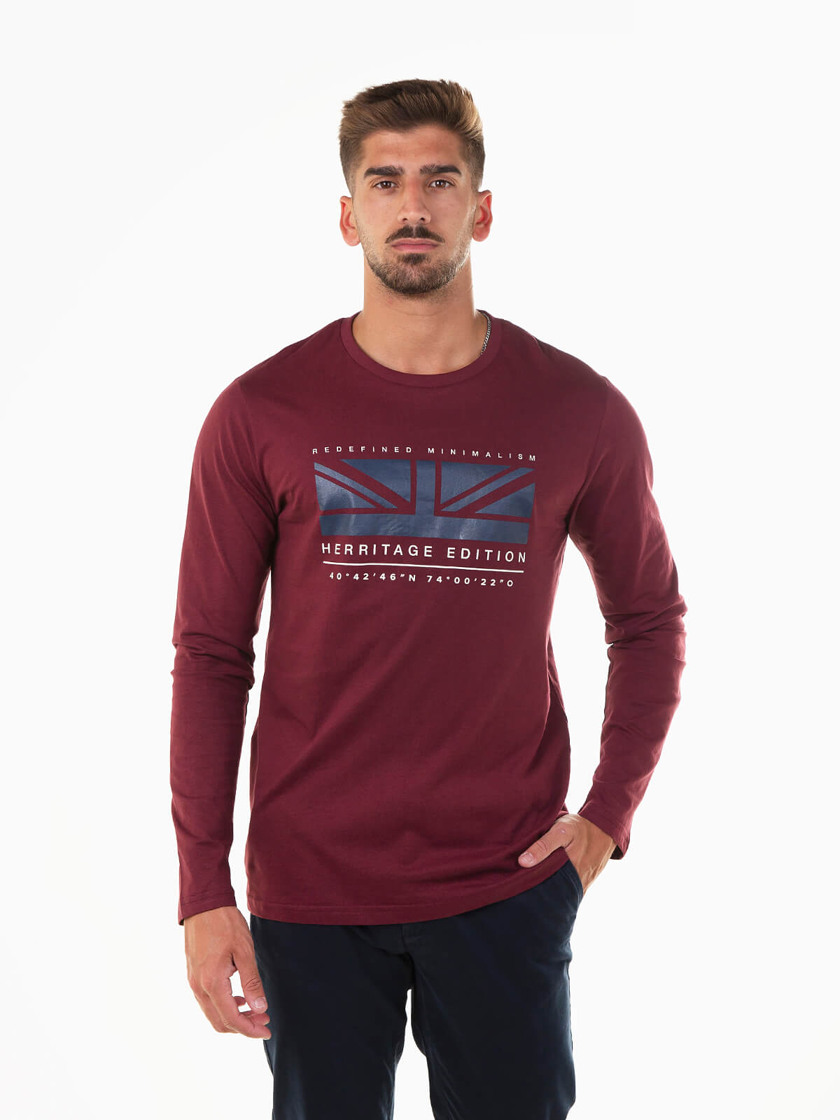 T-shirt bordeaux para homem, com gola redonda e grafismo no peito. Ideal para looks casuais e descontraídos. Combina com jeans slim ou calças cargo para um look casual moderno.