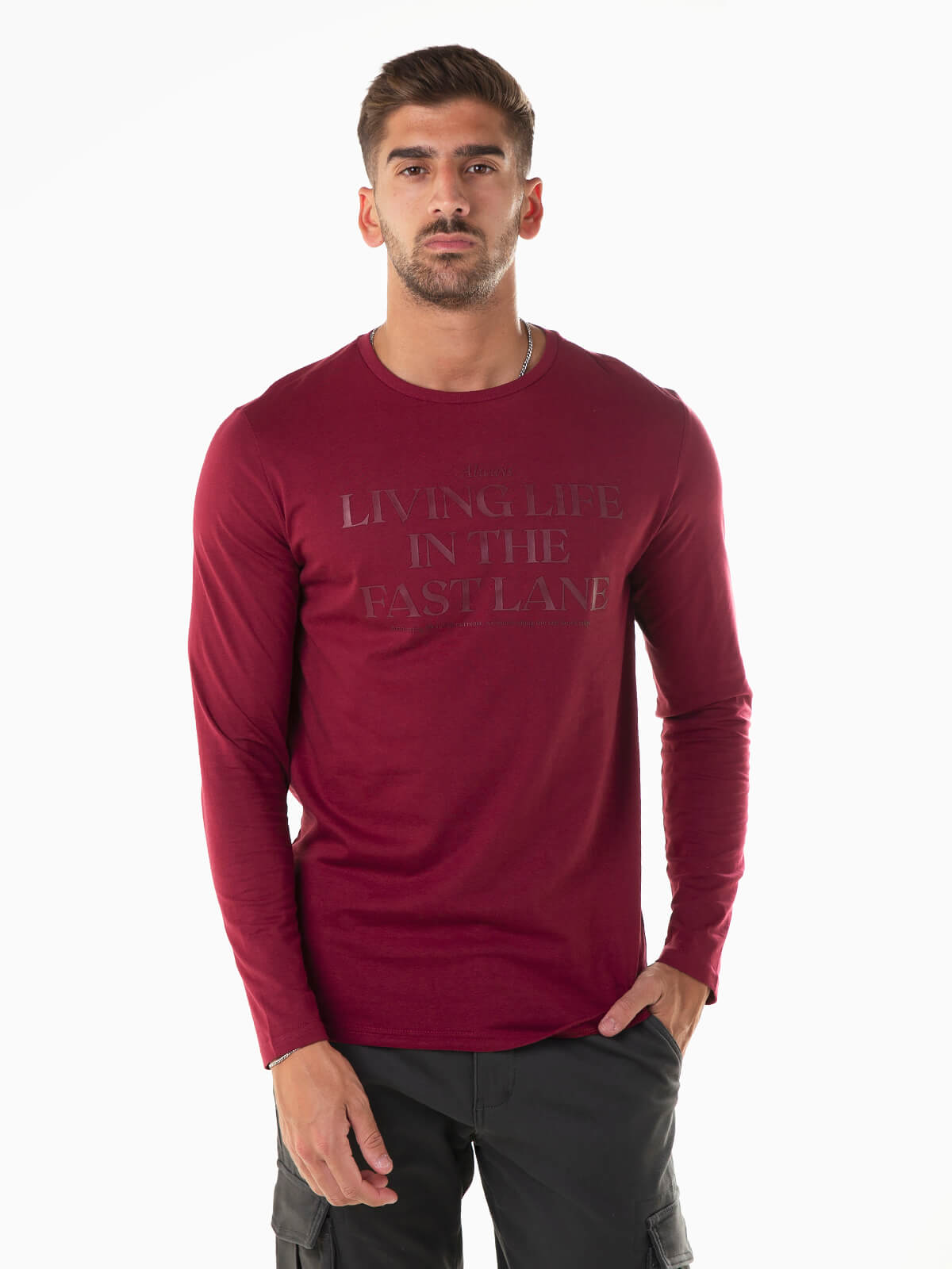 T-shirt bordeaux de manga comprida com mensagem. Long sleeve 100% algodão para homem com gola redonda.