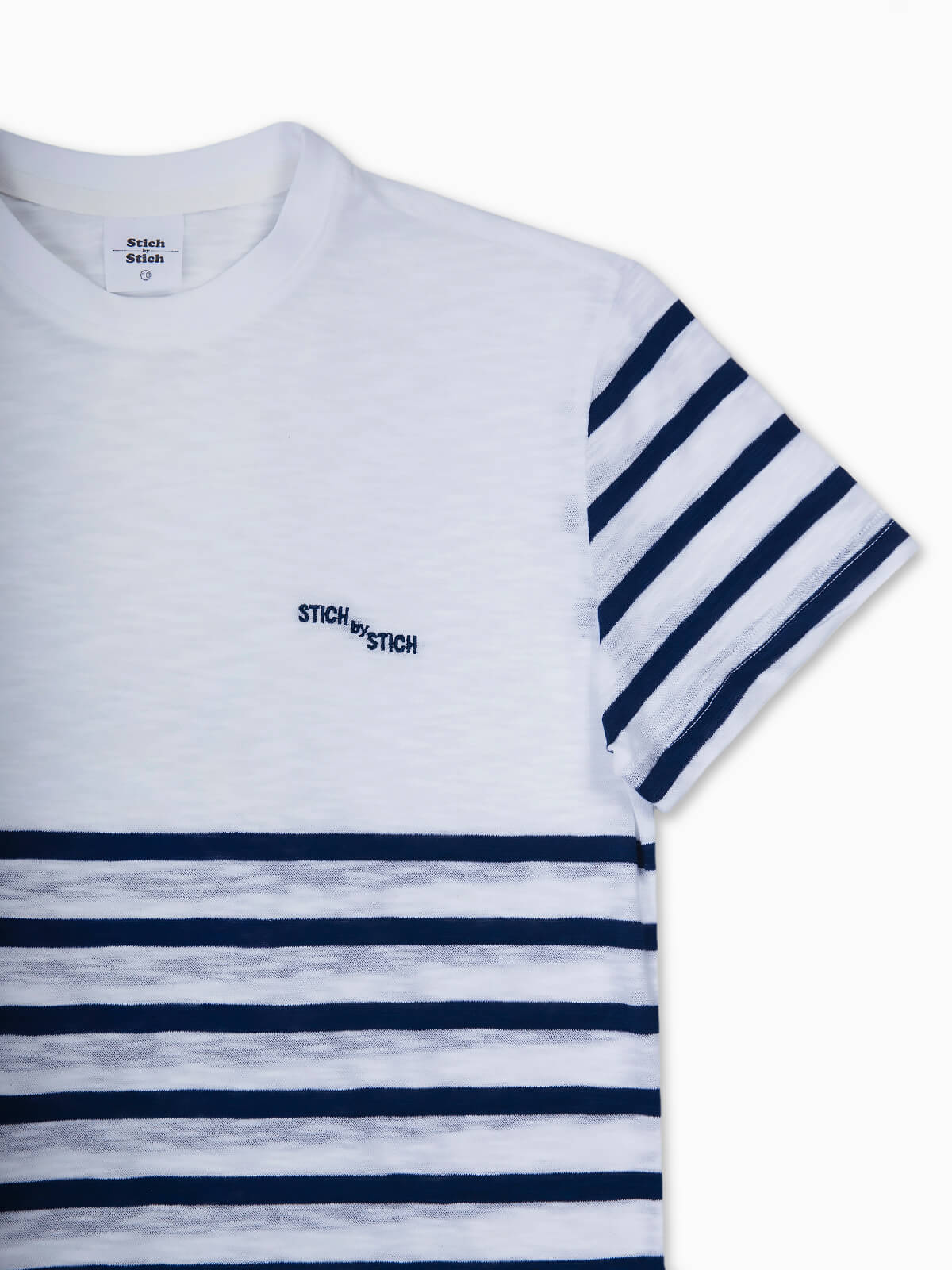 T-shirt branca com azul às riscas para menino. T-shirt de manga curta em tecido 100% algodão com letras bordadas no peito. Gola redonda.