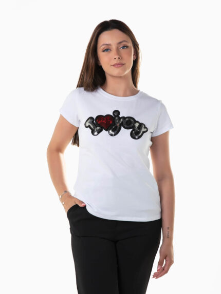 T-shirt branca de manga curta com pestanas bordadas e lantejoulas. T-shirt para senhora com decote redondo.