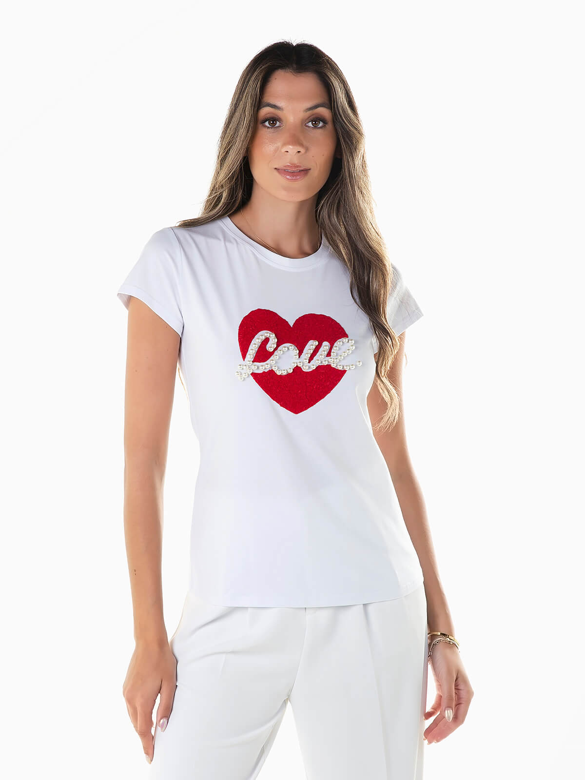 T-shirt branca de manga curta com coração e pérolas em relevo. T-shirt para senhora com decote redondo.