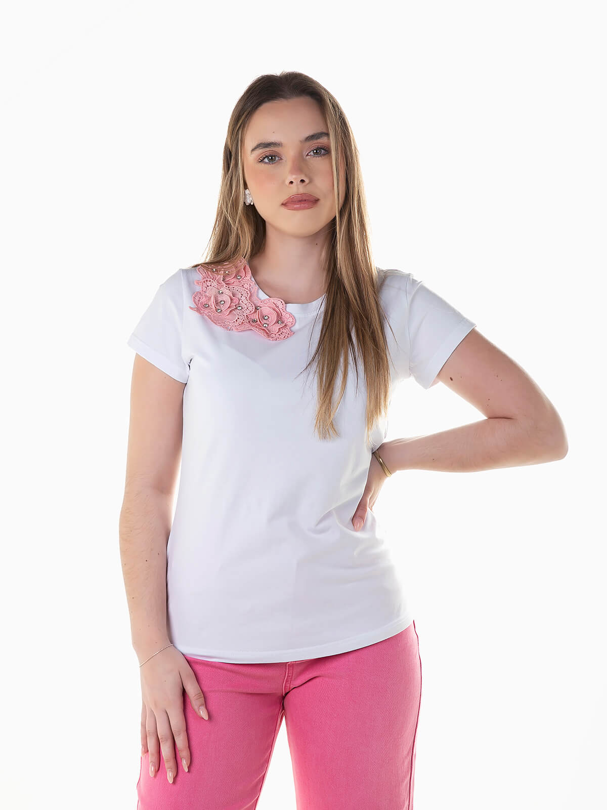 T-shirt branca com flores em crochet e pedras brilhantes aplicadas. T-shirt para senhora com decote redondo.