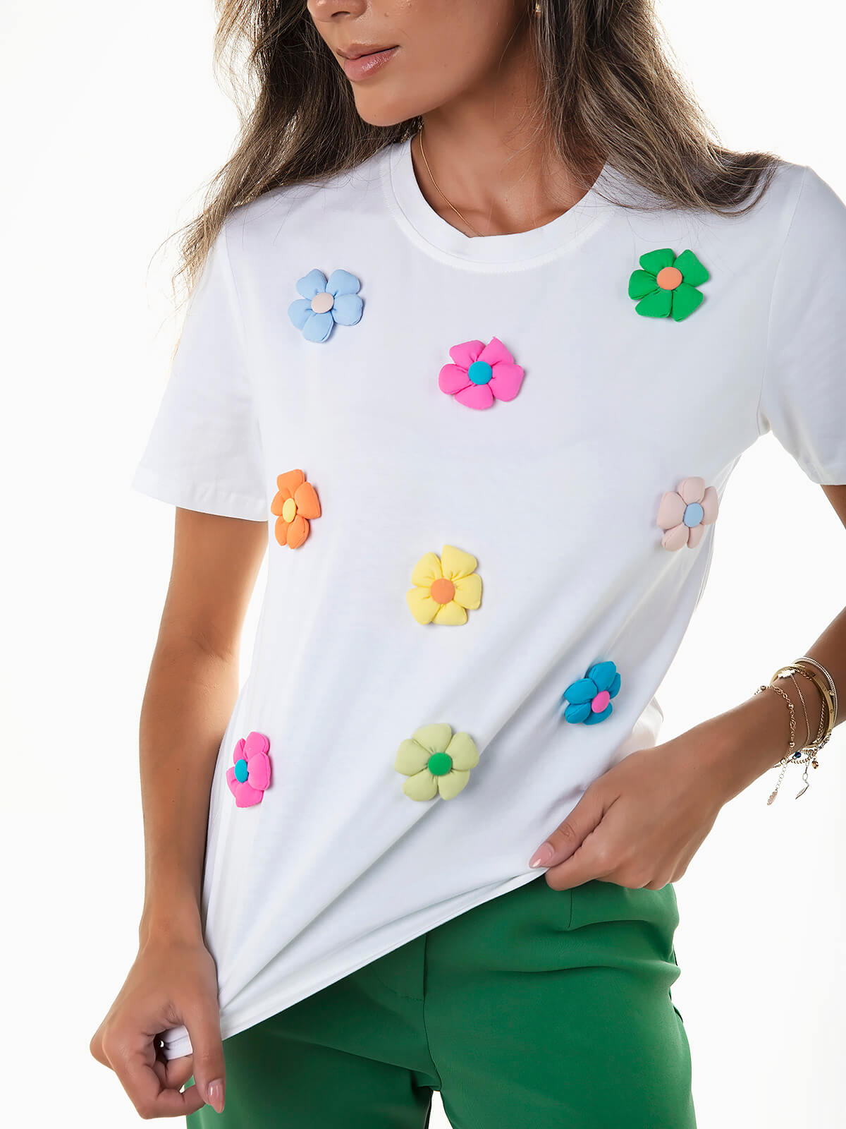 T-shirt branca com aplicação de flores acolchoadas coloridas para senhora. T-shirt manga curta com decote redondo.